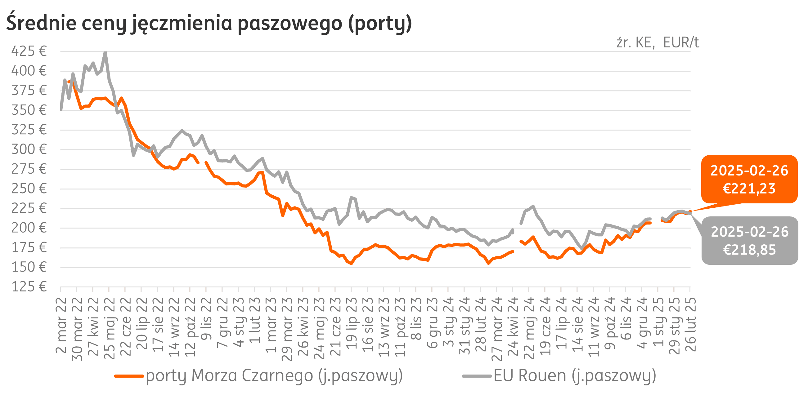 W ostatnim tygodniu lutego w Rouen (Francja) notowania jęczmienia paszowego spadły w ujęciu miesięcznym o 0,4% i 26 lutego 2025 r. wyniosły 219 EUR/t, o 19% powyżej poziomu ubiegłorocznego. W portach Morza Czarnego cena 221 EUR/t oznacza wzrost o 2,2% w ciągu miesiąca, a notowania te kształtują się o 33% wyżej niż rok wcześniej.