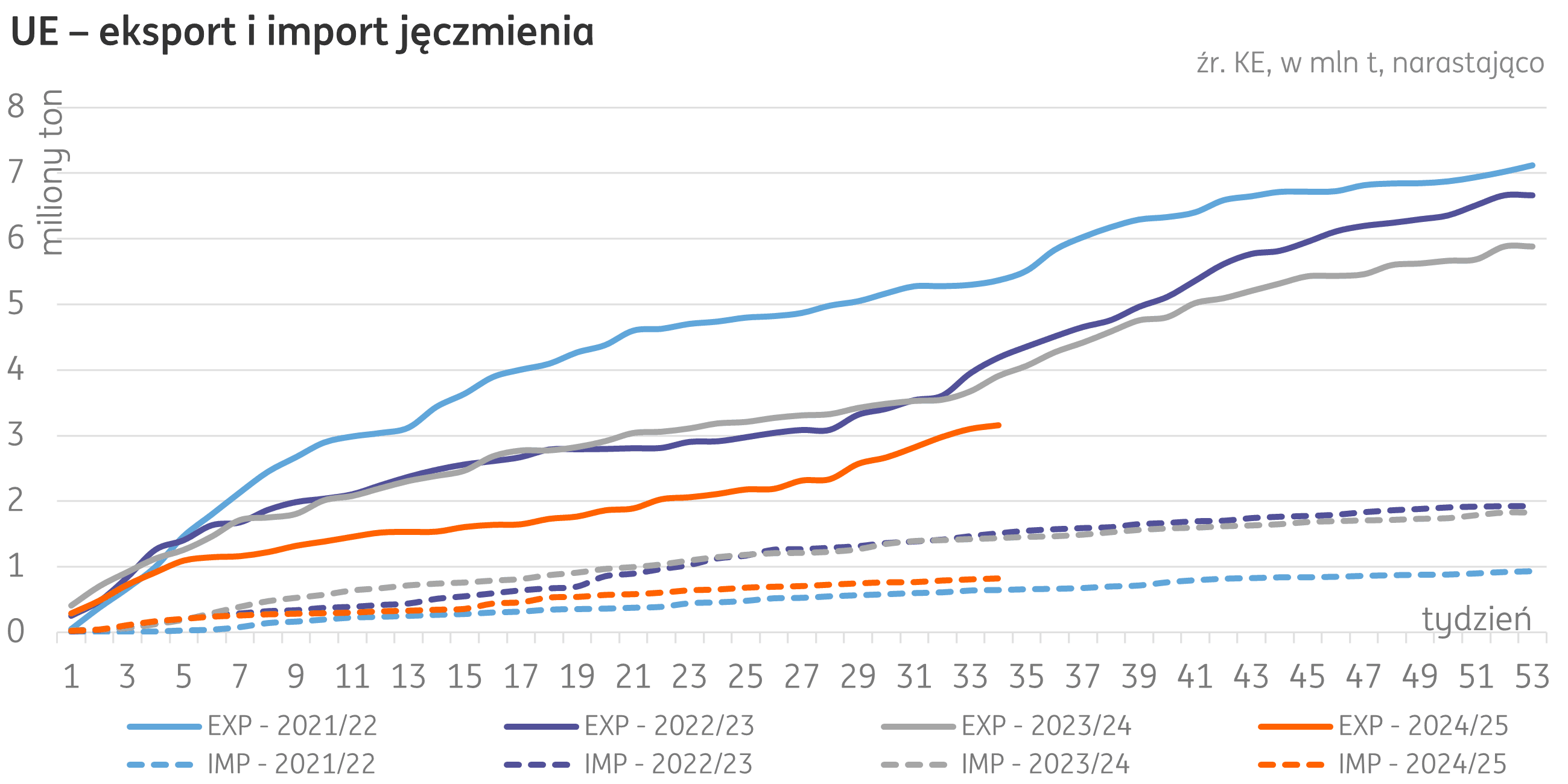 Unia Europejska. Prognozowane przez KE zużycie jęczmienia w sezonie 2024/25 jest na poziomie 42,1 mln t, porównywalnie do ubiegłych prognoz, obniżona produkcja ma wpłynąć na zmniejszenie eksportu do 10 mln t i zapasów końcowych do 2,0 mln t przy obniżonym imporcie na poziomie 1,3 mln t.