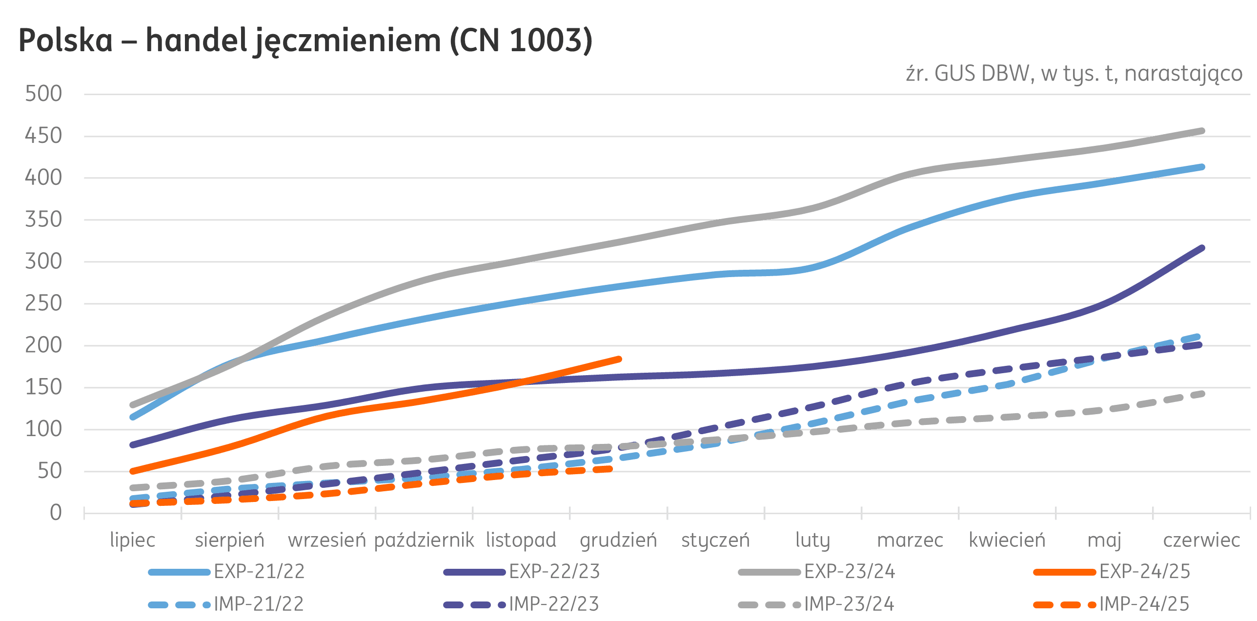 Handel. Po pierwszej połowie sezonu 2024/25 eksport jęczmienia spadł do 184 tys. t, o 43% poniżej poziomu ubiegłorocznego. W grudniu eksport jęczmienia to 28 tys. t, o 27% powyżej grudnia 2023 r. Import od początku sezonu również pozostaje na poziomie niższym od ubiegłorocznego z wolumenem 53 tys. t (-33% r/r), a w samym grudniu osiągnął 7 tys. t, o 95% wyżej niż przed rokiem.