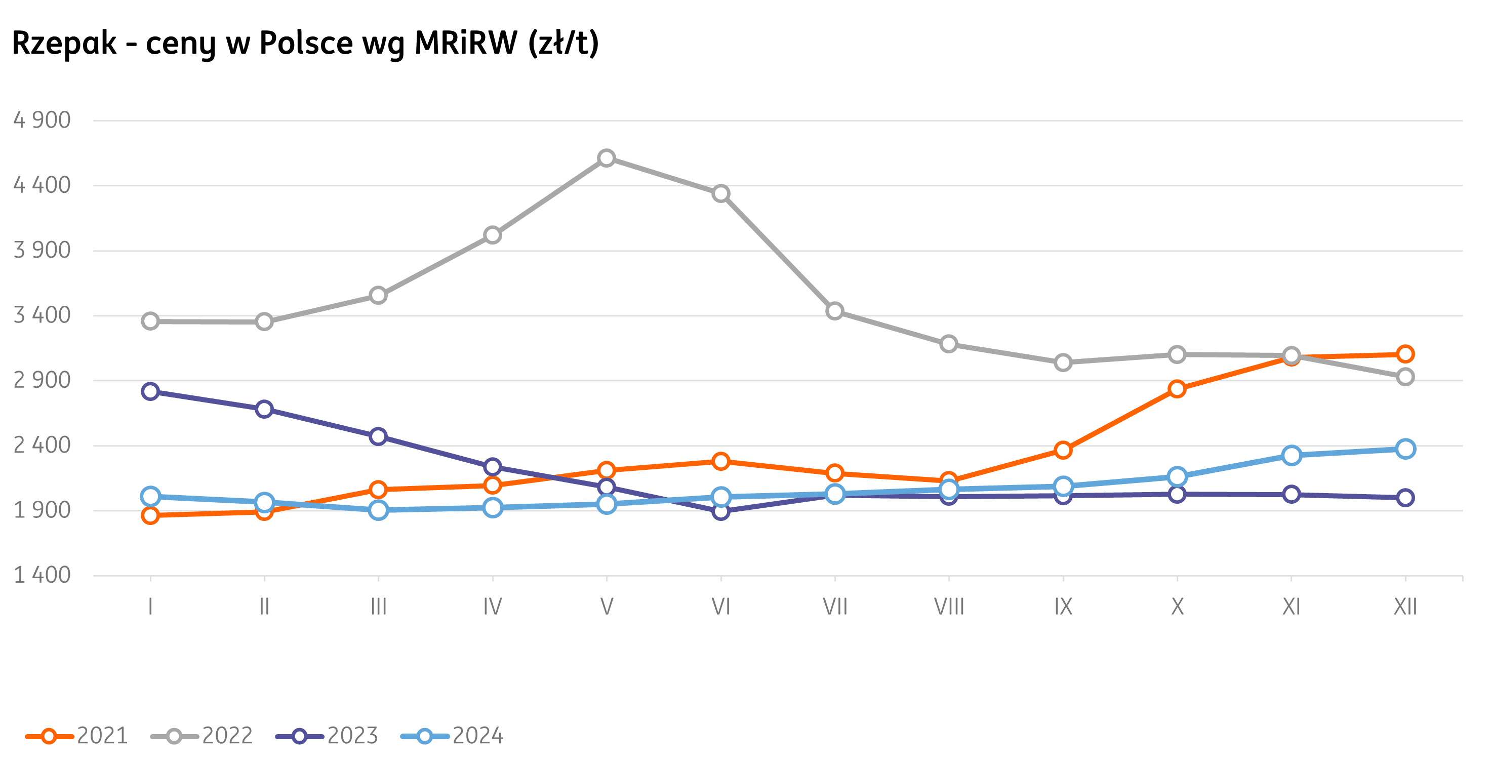 W tygodniu kończącym się 23 lutego 2025 r. średnie stawki za rzepak wyniosły 2399 zł/t zgodnie z danymi MRiRW. W porównaniu z wcześniejszym tygodniem jest to spadek o 4 zł. W stosunku do zeszłego roku bieżące ceny są o 23% wyższe.