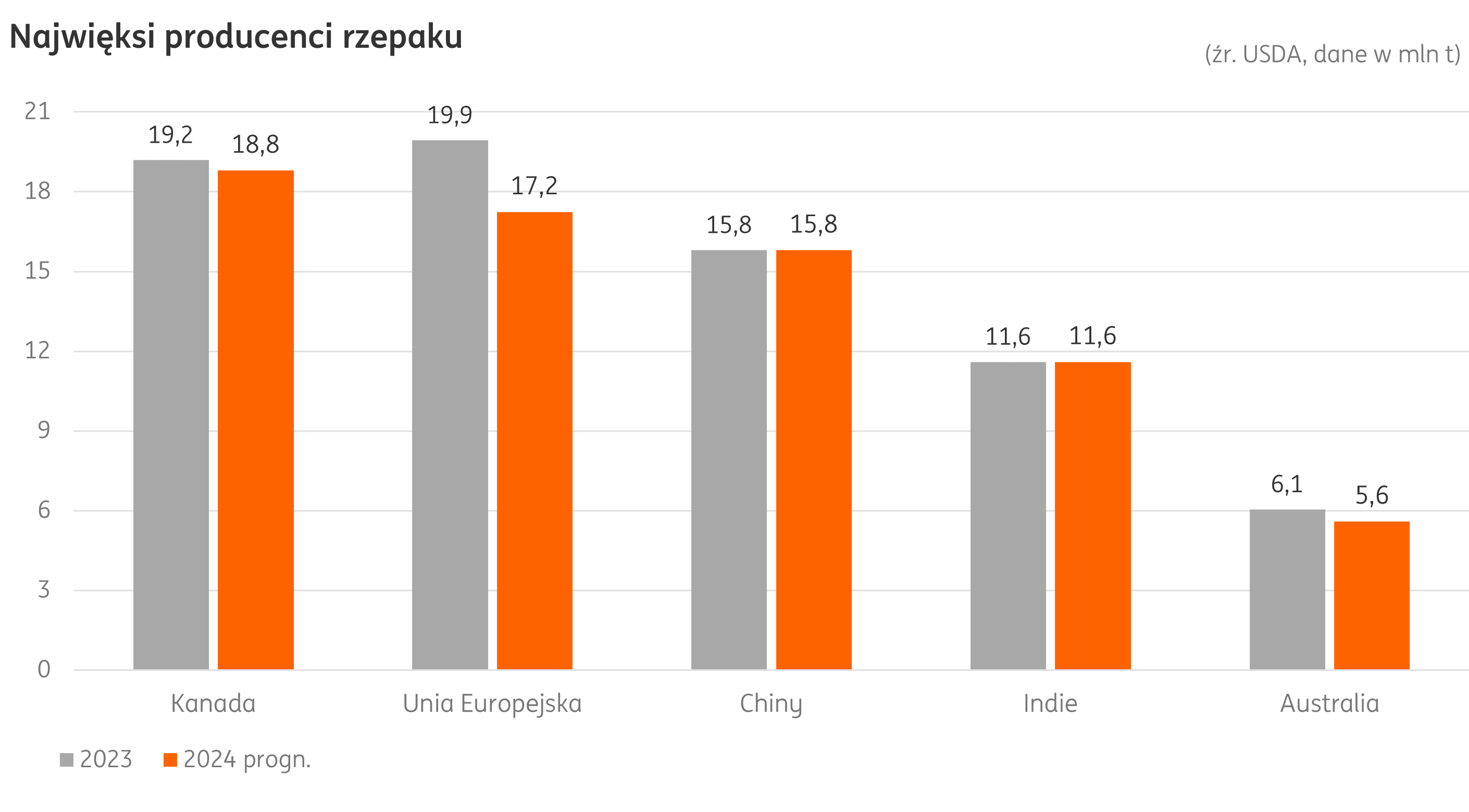 Świat: W lutym USDA (Departament Rolnictwa USA) minimalnie podwyższył szacowany areał i wolumen zbiorów rzepaku w stosunku do danych sprzed miesiąca. Pozwoliło to nieznacznie zniwelować wcześniejszą różnicę w stosunku do danych z sezonu 2023/24. Globalna produkcja w wysokości niewiele ponad 85 mln t jest o blisko 5% niższa niż przed rokiem (zob. tab.). Jest to głównie wynikiem niższych zbiorów w Unii Europejskiej (17,2 obecnie vs. 19,9 mln t sezon wcześniej) i na Ukrainie (3,75 vs. 4,75 mln t), na co złożyły się słabsza wydajność i obniżony areał zasiewów.