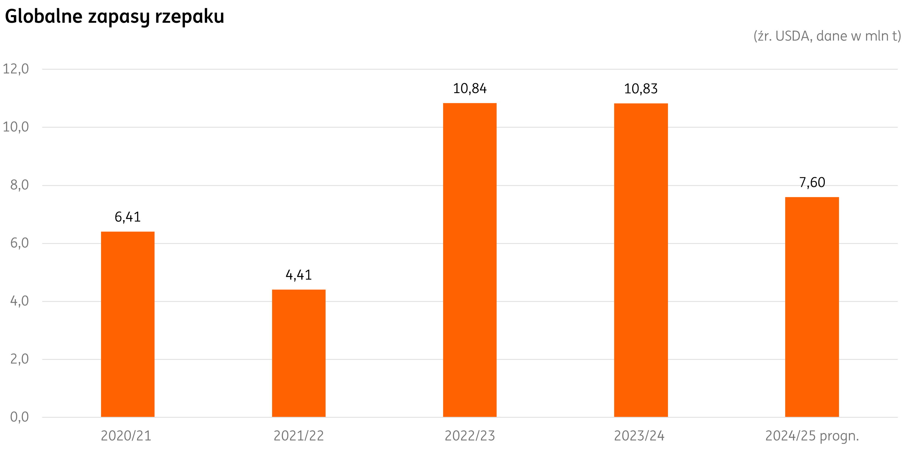 Po sporej obniżce zapasów końcowych w grudniowej prognozie, nowy rok przyniósł podwyżkę wolumenu. Mimo kosmetycznej korekty w dół w lutym, zapasy nie spadły poniżej 7,6 mln t. W dalszym ciągu wartość jest niższa niż przed rokiem (o 30%). Największy wolumen jest skupiony w trzech miejscach – Kanadzie, Chinach i Unii Europejskiej. Wszystkie obszary odnotowały obniżki w stosunku do ubiegłego sezonu 2023/24 co rzutuje na ogólny poziom zapasów końcowych. Kanada z 2,7 do 1,7 mln t; Chiny z 4,7 do 3,3 mln t i UE z 1,5 do 1,0 mln t.