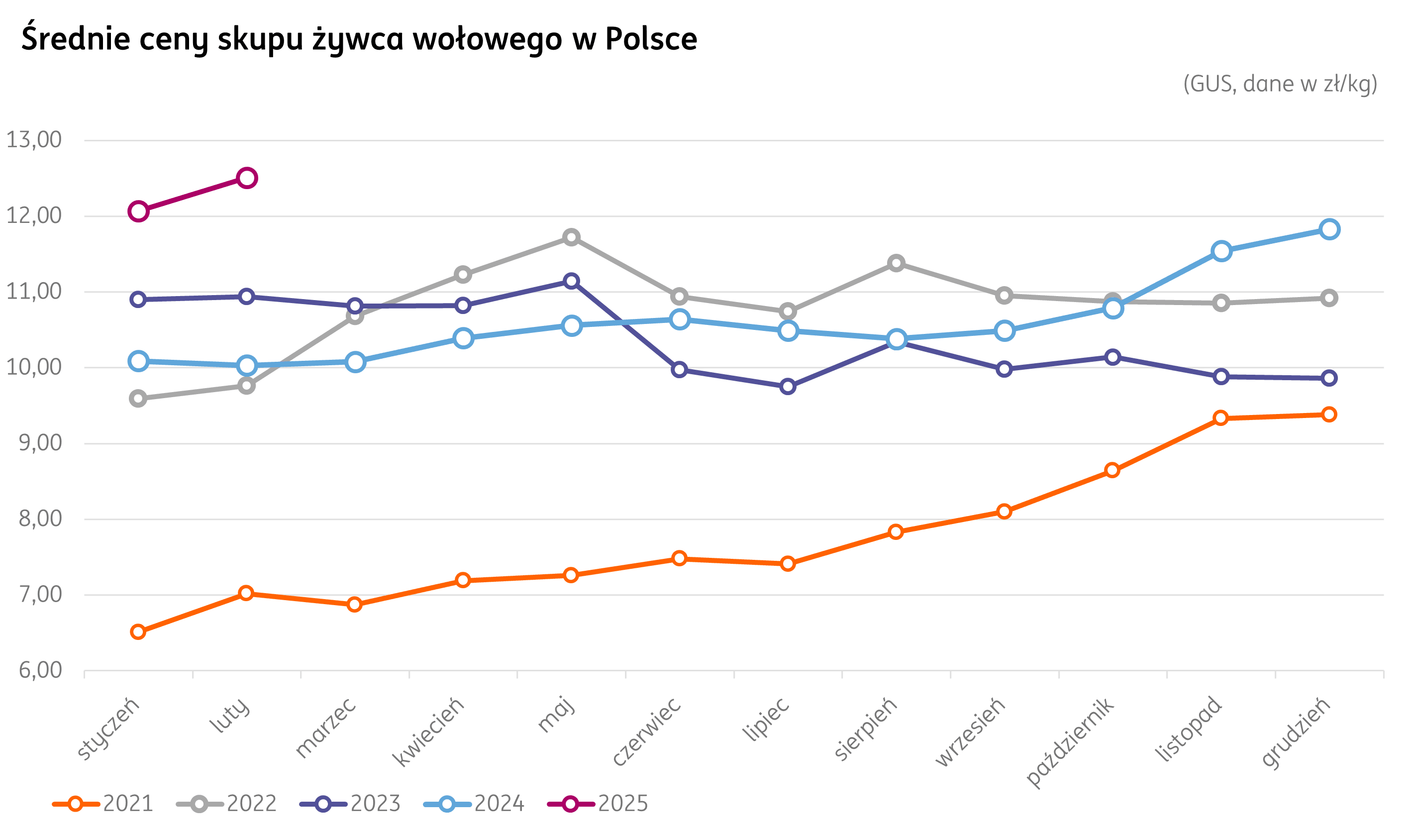 W lutym 2025 r. średnie stawki za bydło mięsne kolejny miesiąc z rzędu odnotowały wzrost. Cena 12,51 zł/kg jest 44 gr wyższa niż w styczniu (+1,2%). W stosunku do zeszłego roku bieżący poziom jest wyższy o 7,7% (+2,48 zł).