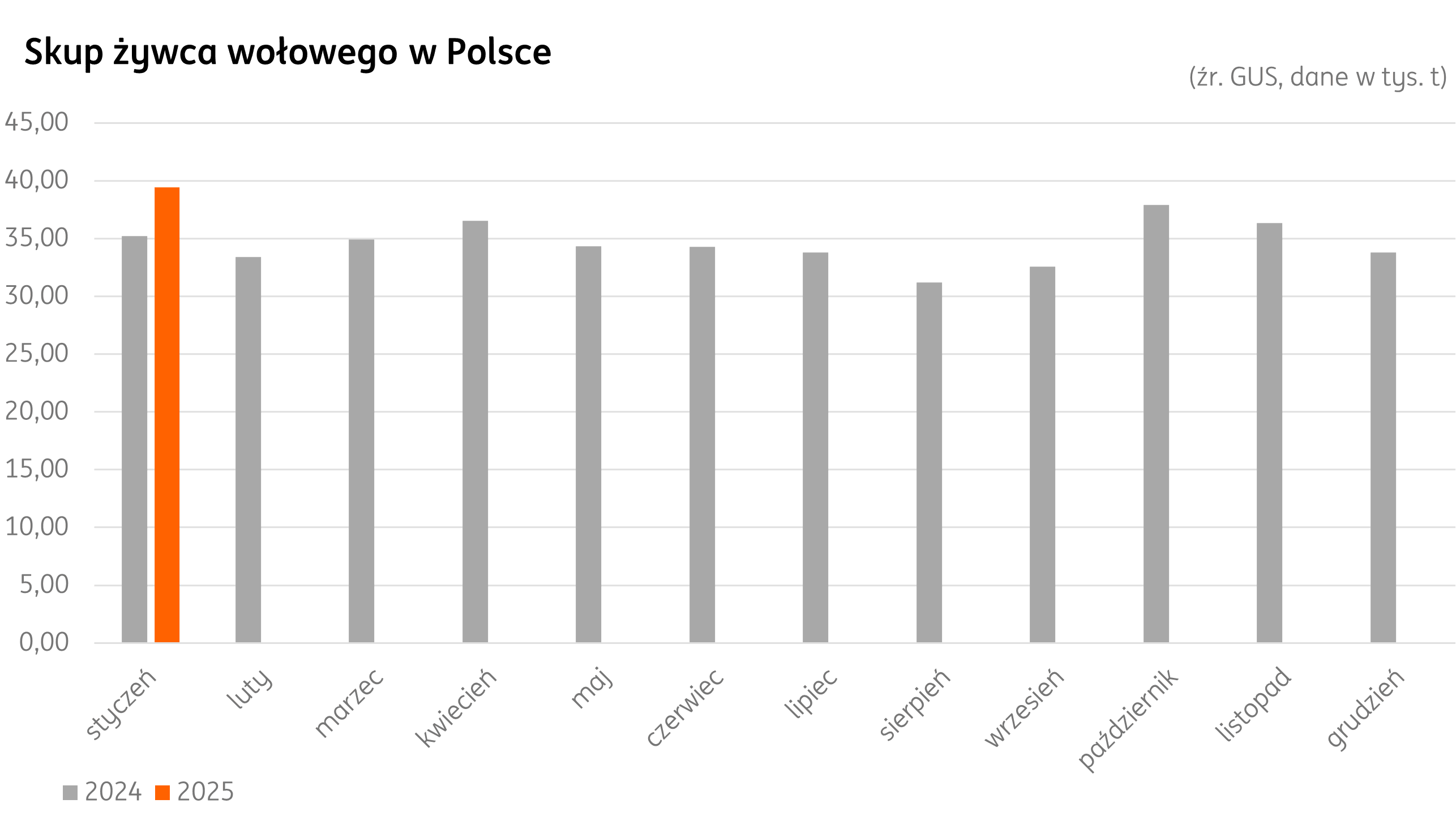 Skup w Polsce: Początek 2025 r. wyróżnił się wyższym wolumenem, zarówno w porównaniu z grudniem, jak i pierwszym miesiącem 2024 r. W styczniu 2025 r. wartość skupu bydła w kraju przekroczyła 39 tys. t. To o 12% więcej niż w analogicznym okresie ubiegłego roku.