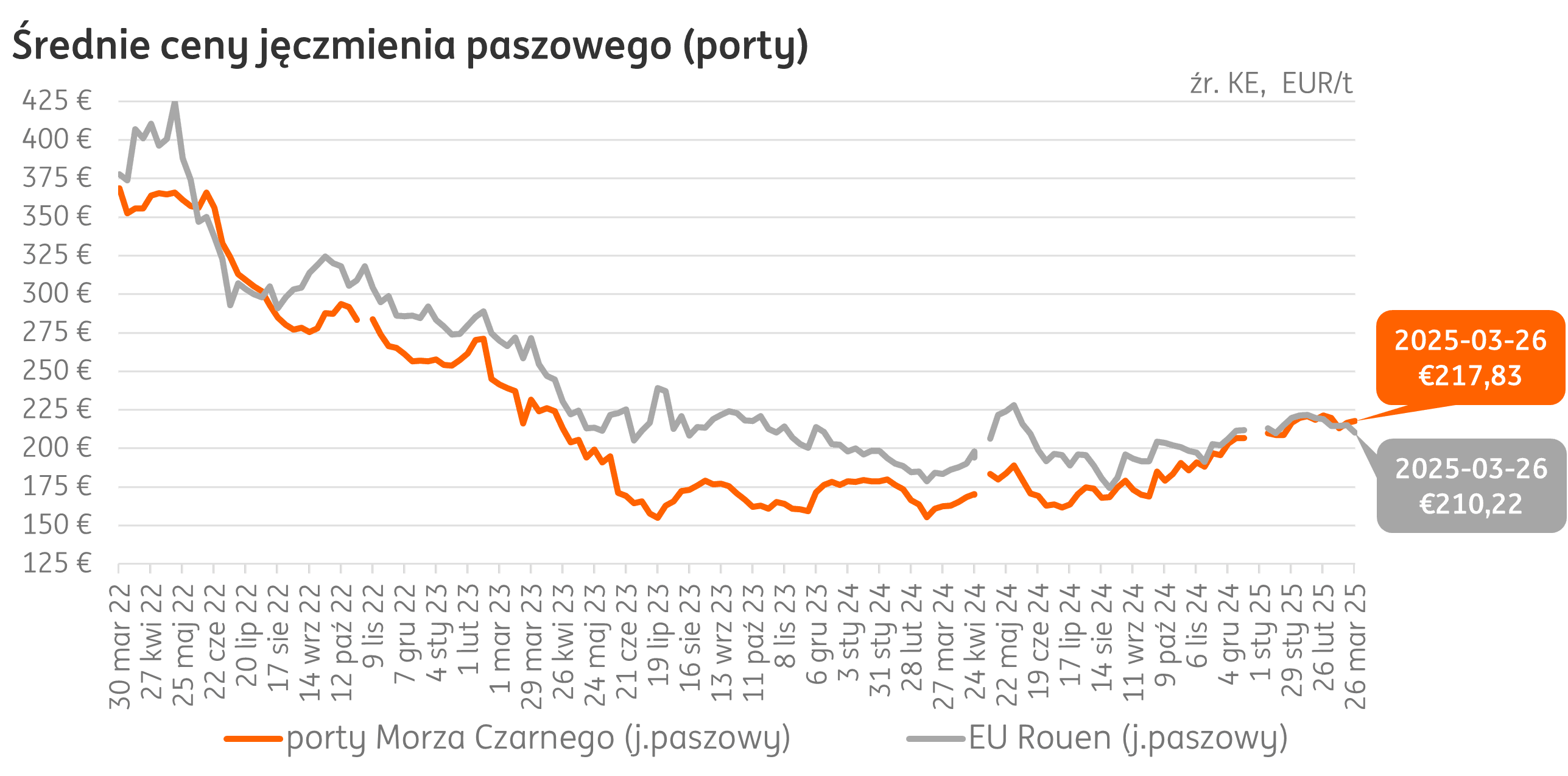W ostatnim tygodniu marca w Rouen (Francja) notowania jęczmienia paszowego spadły w ujęciu miesięcznym o 4% i 26 marca 2025 r. wyniosły 210 EUR/t, o 15% powyżej poziomu ubiegłorocznego. W portach Morza Czarnego cena 218 EUR/t oznacza spadek o 2% w ciągu miesiąca, a cena kształtuje się o 34% wyżej niż rok wcześniej.