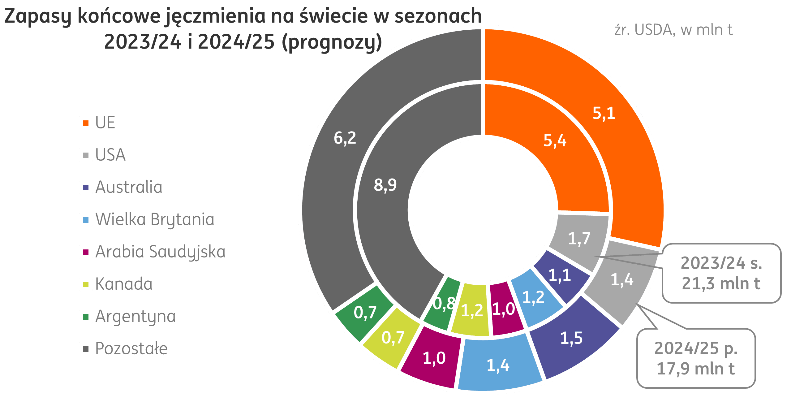 Świat. Według najnowszych raportów USDA, globalne zapasy jęczmienia na koniec sezonu 2024/25 mają osiągnąć 17,9 mln t, to spadek o 3,5 mln t (-16% r/r) w relacji rocznej. W porównaniu z poprzednim sezonem, najistotniejsze zmiany zajdą w zapasach końcowych, które mają zmniejszyć się w Kanadzie (-431 tys. t), w Stanach Zjednoczonych (-331 tys. t) i w Unii Europejskiej (-350 tys. t).