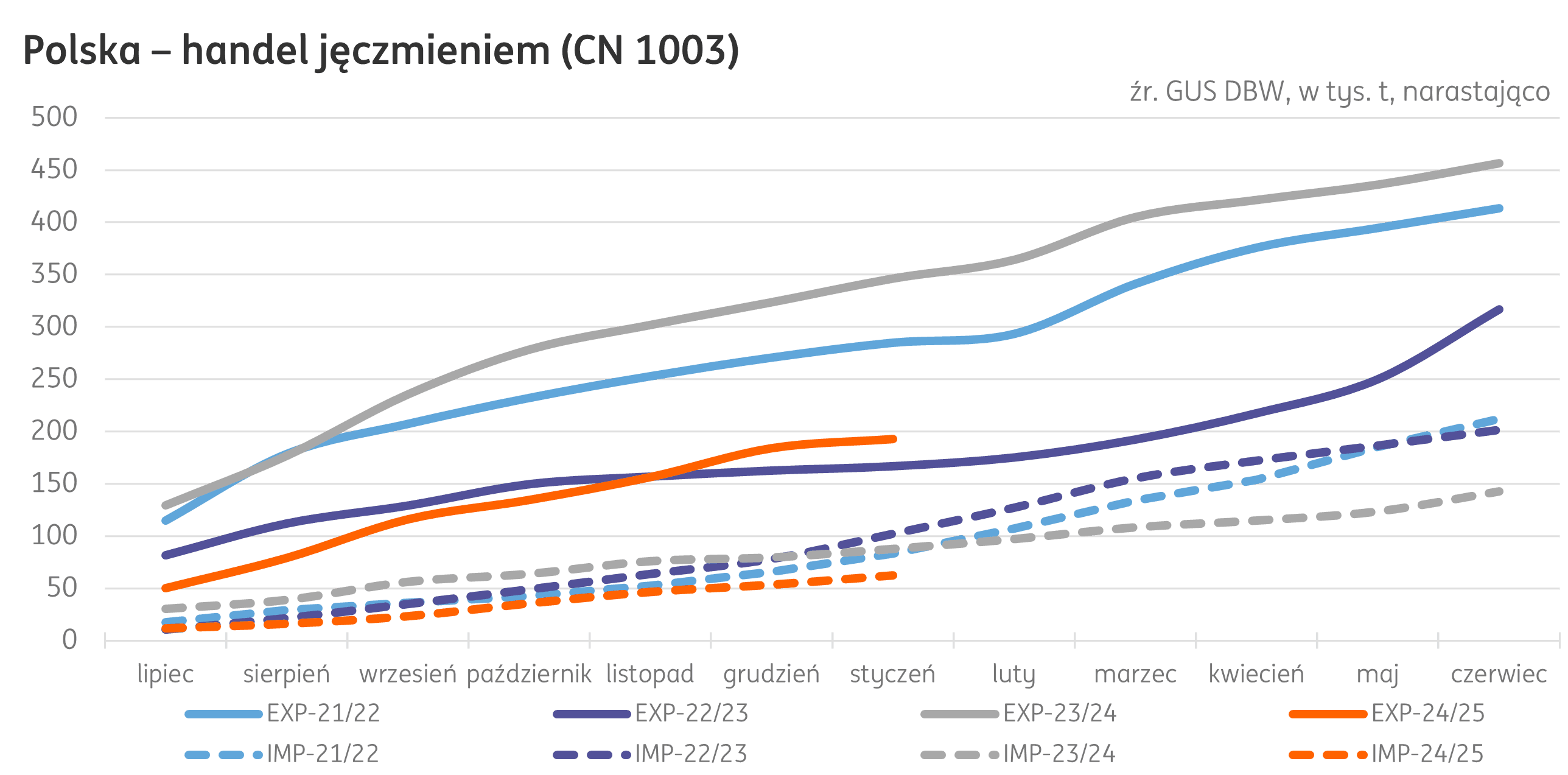 Handel. Po siedmiu miesiącach sezonu 2024/25 eksport jęczmienia spadł do 193 tys. t, o 44% poniżej poziomu ubiegłorocznego. W styczniu eksport jęczmienia to zaledwie 9 tys. t, o 61% poniżej stycznia 2024 r. Import od początku sezonu również pozostaje na poziomie niższym od ubiegłorocznego z wolumenem 62 tys. t (-29% r/r), a w samym styczniu osiągnął 9 tys. t, o 9% wyżej niż przed rokiem.