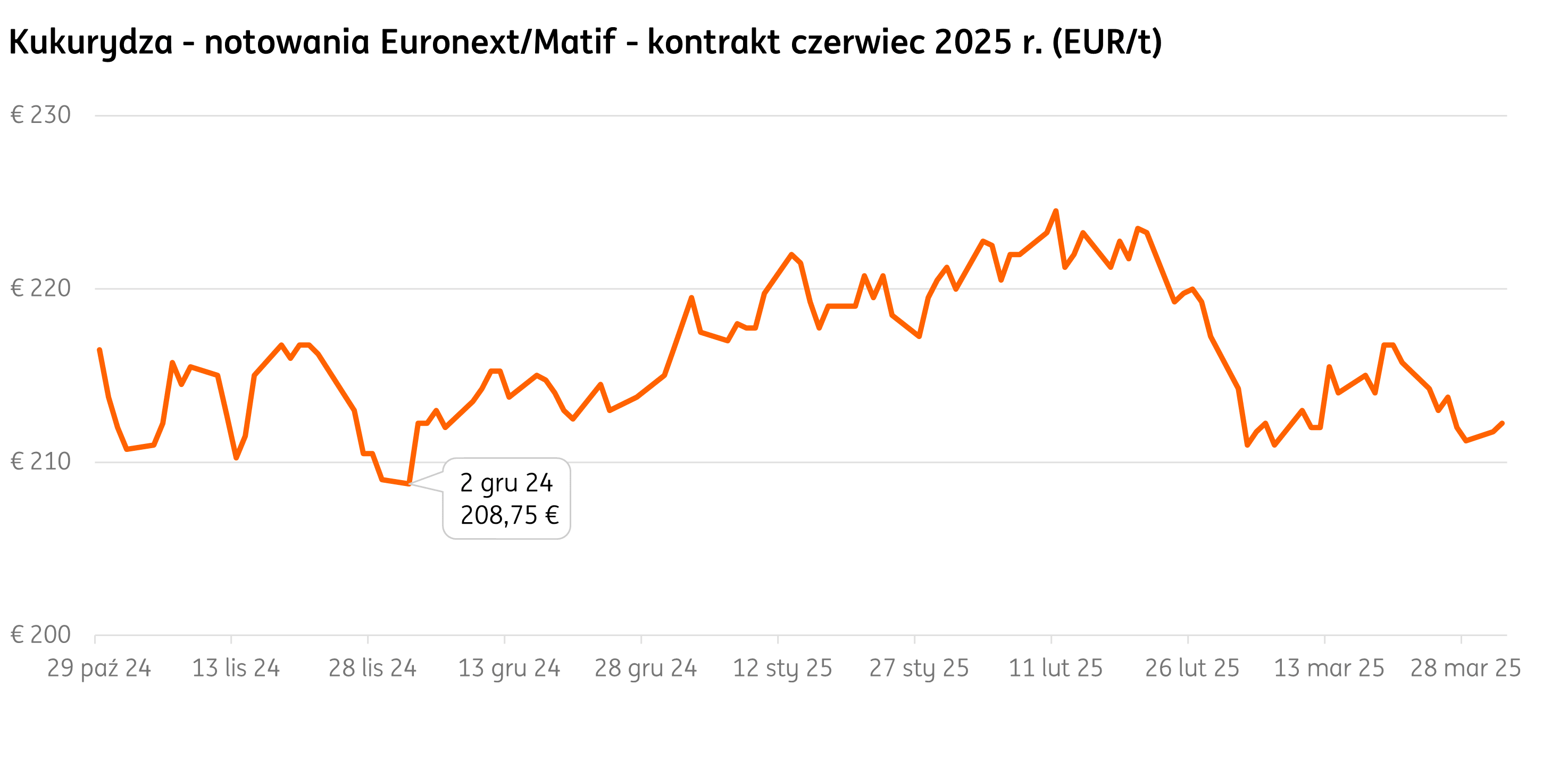 Marzec na rynku kukurydzy był zmienny. Jednak notowania na Euronext/Matif nie spadały poniżej granicy 211 EUR. Przez wiekszość miesiąca utrzymywał się trend wzrostowy z maksimum 217 EUR. W ostatniej dekadzie dominowała jednak korekta.