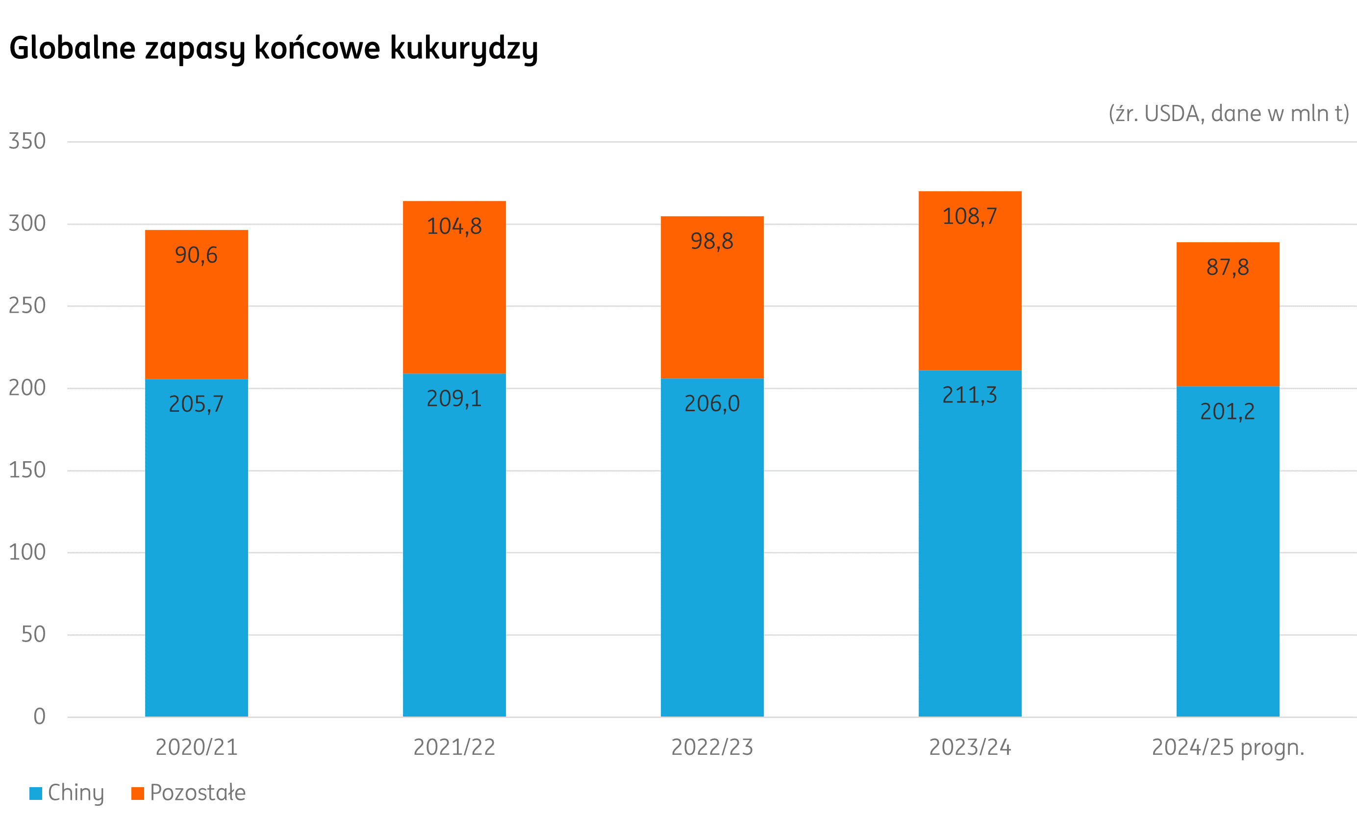 Kolejny miesiąc z rzędu szacunki zapasów końcowych ulegają niewielkiej redukcji. W marcu ich wolumen szacowany jest na niecałe 289 mln t. Utrzymuje się różnica w stosunku do poprzedniego roku. Wartość jest niższa niż na koniec poprzedniego sezonu 2023/24 o 8%. Obok Chin (201 mln t) największy wolumen jest w USA (39 mln t).