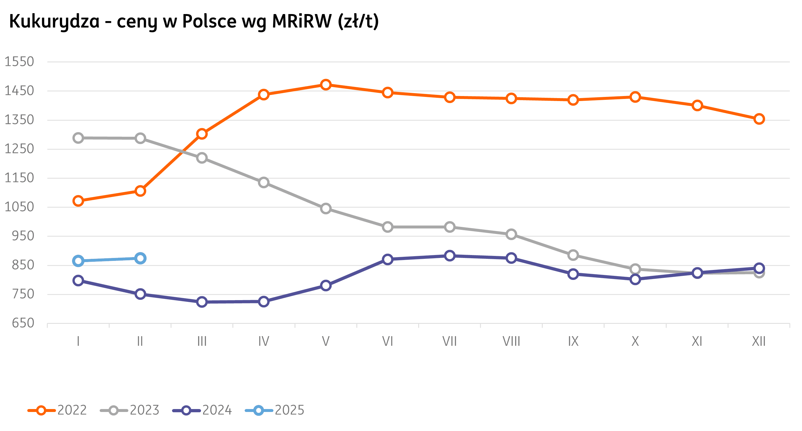 Zgodnie z systemem informacji MRiRW kukurydza paszowa w lutym 2025 r. odnotowała podwyżkę. Wartość 874 zł/t w ujęciu miesięcznym była o 9 zł wyższa. W porównaniu z lutym 2023 r. stawka jest wyższa o 123 zł (16%).