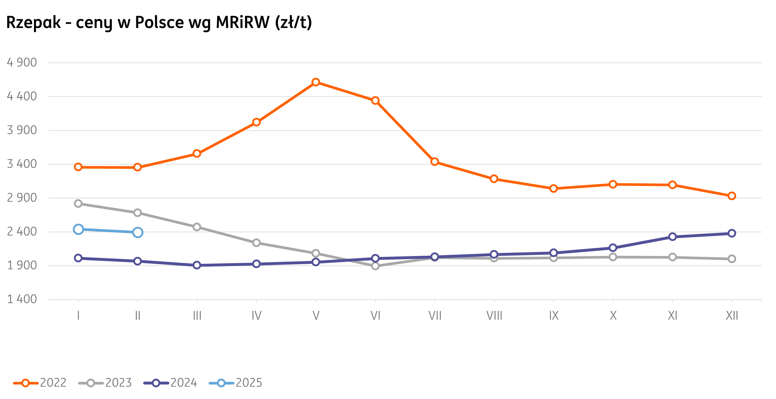 W tygodniu kończącym się 23 marca 2025 r. średnie stawki za rzepak wyniosły 2440 zł/t zgodnie z danymi MRiRW. W porównaniu z wcześniejszym tygodniem jest to spadek o 27 zł (-1%). W stosunku do zeszłego roku bieżące ceny są o 28% wyższe.