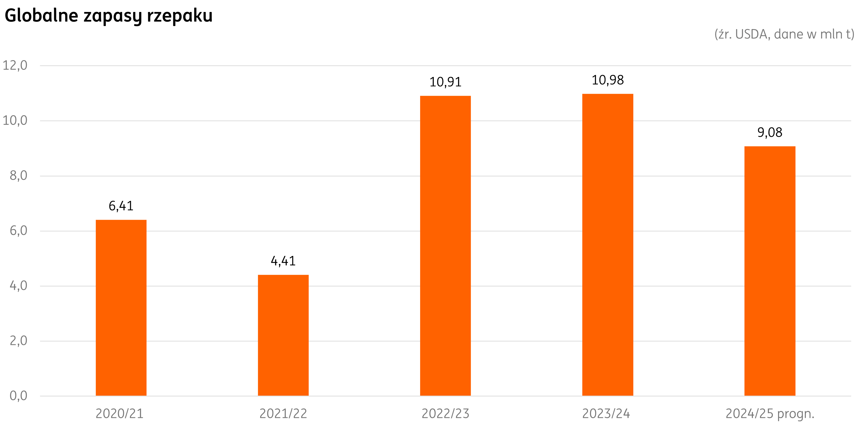 Korekta wolumenu konsumpcji rzepaku przez USDA zmniejszyła nieznacznie wolumen. W marcu jest on oceniany na 87,22 mln t. To niewiele ponad 1% mniej niż w poprzedniej prognozie i blisko 2% poniżej ubiegłorocznego poziomu. Redukcja w stosunku do zeszłego roku wyniki głównie z obniżki w Chinach (20,7 mln t vs. 19,6 mln t) i Unii Europejskiej (24,1 vs 25,1 mln t).