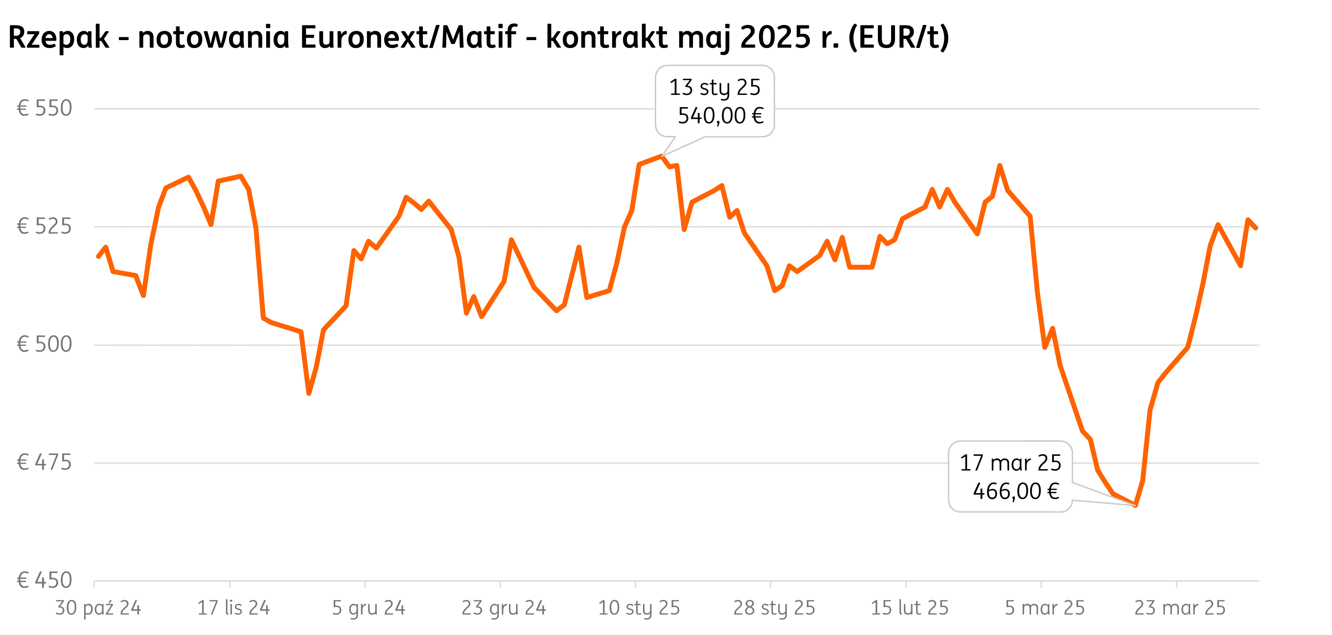 Notowania rzepaku w marcu znajdowały się pod wpływem doniesień płynących z rynków międzynarodowych. Do tąpnięcia notowań na Euronext/Matif doszło w ślad za wprowadzeniem zaporowego cła na kanadyjski rzepak przez Chiny. Jednak wraz z końcem marca kontrakty odrabiały wcześniejszą stratę. Wpłynęła na to m.in. ograniczona podaż rzepaku w krajach Unii Europejskiej (kontrakt majowy). Wzrosty dotyczące notowań z nowych zbiorów było hamowane przez informacje o dobrej kondycji upraw.