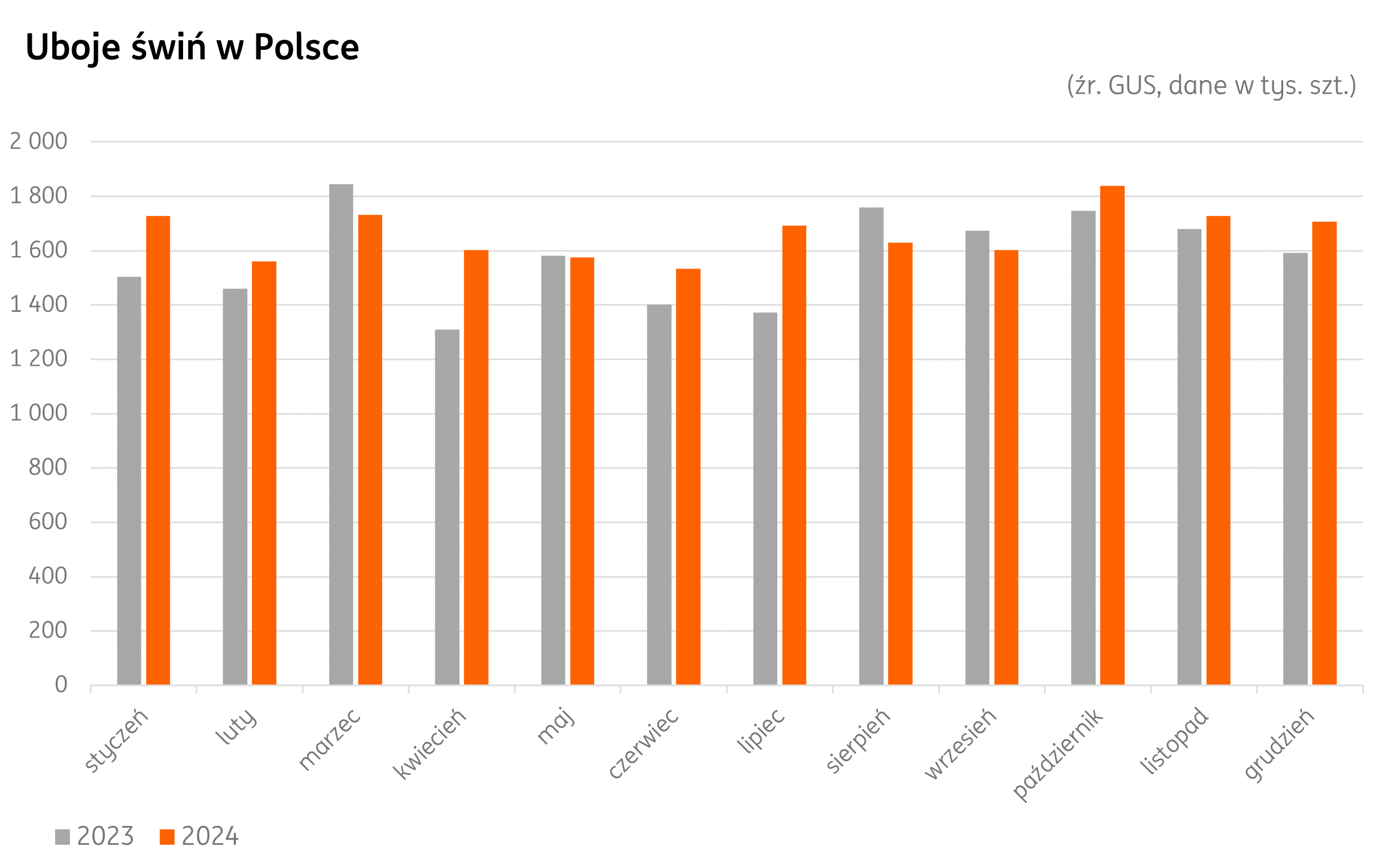 Uboje w Polsce: W 2024 r. utrzymywała się wyższa dynamika tempa ubojów trzody w kraju. Wyższą dynamiką odznaczył się zwłaszcza ostatni kwartał zeszłego roku. Według wstępnych danych w 2024 r. wolumen ubojów zbliżył się do 20 mln szt. To o 5,4% więcej niż w 2023 r.