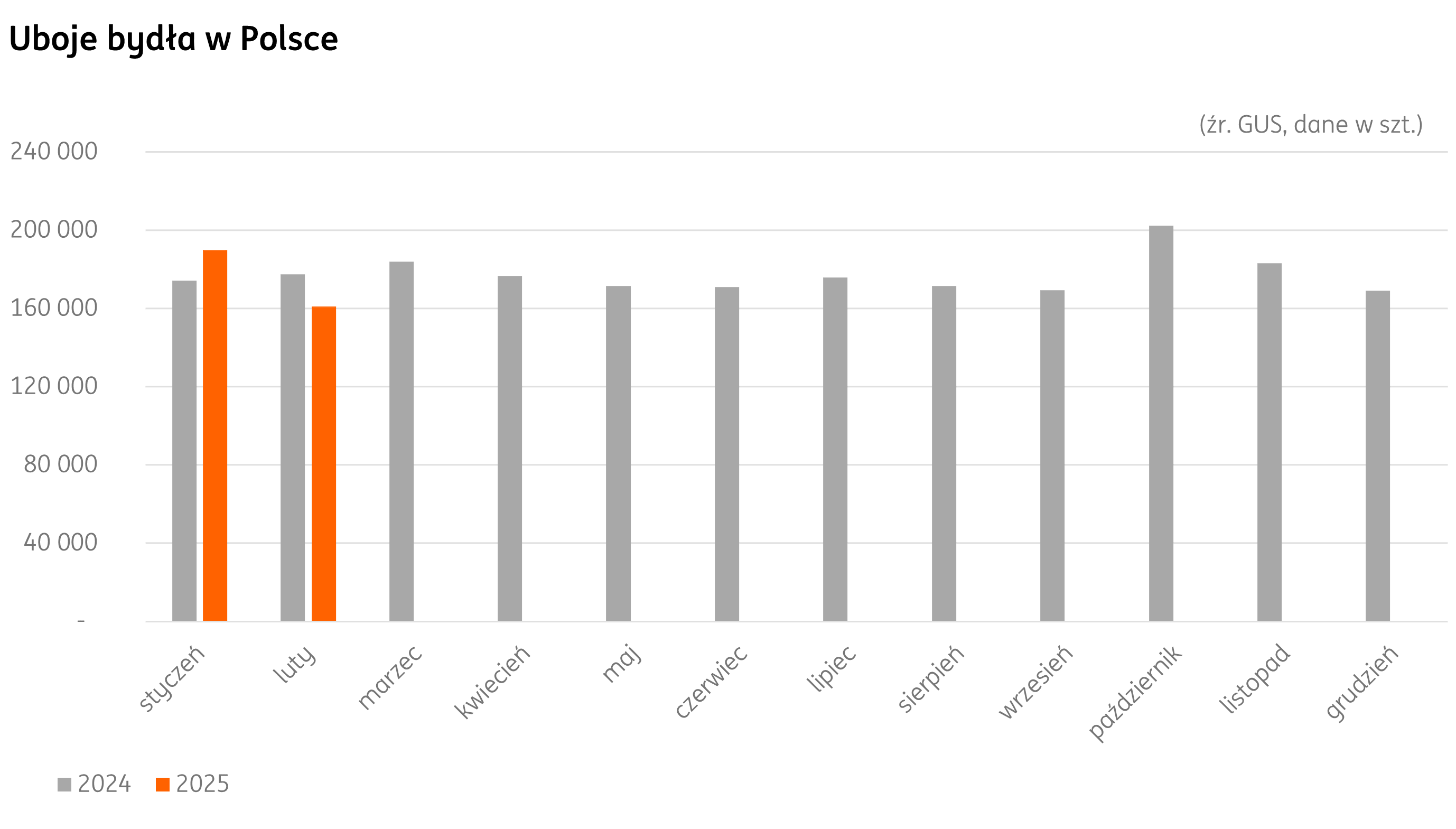 Uboje w Polsce: Po dużym przyśpieszeniu w styczniu, luty wyróżnił się spadkiem wolumenu ubojów bydła. Według wstępnych danych GUS wartość w pierwszych dwóch miesiącach 2025 r. przekroczyła poziom 351 tys. szt. W stosunku do początku 2024 r. wolumen został utrzymany na praktycznie tym samym poziomie (-0,2% r/r).