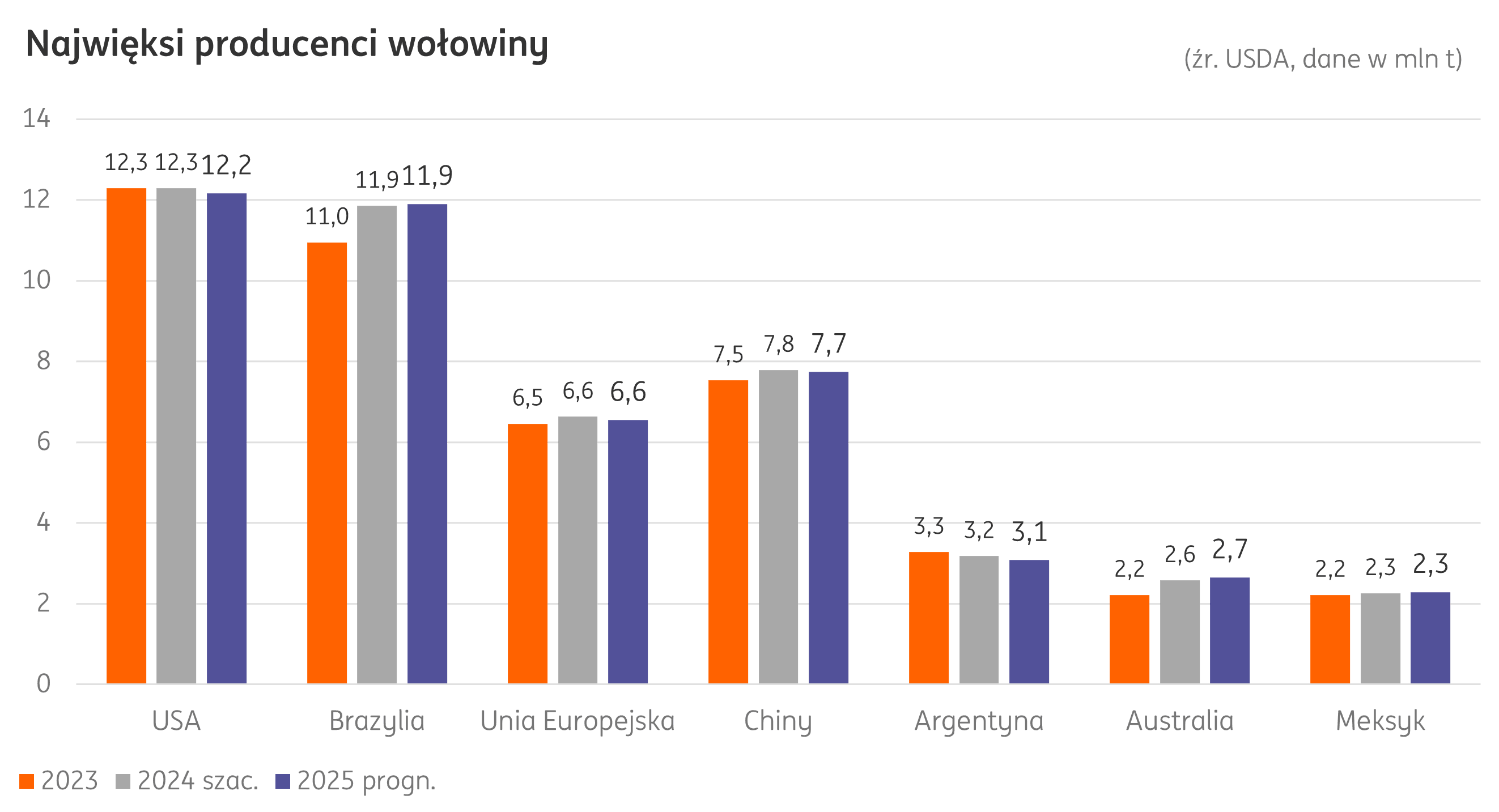 Według najnowszej prognozy USDA (Departament Rolnictwa USA) globalna produkcja wołowiny w 2025 r. ma pozostać praktycznie niezmieniona w stosunku do 2024 r. i wyniesie 61,6 mln t. Spadająca produkcja w Stanach Zjednoczonych i Unii Europejskiej jest rekompensowana przez wzrosty w Brazylii, Indiach i Australii. Produkcja w Brazylii ma być nieznacznie wyższa, ale wzrośnie do rekordowych 11,9 mln t. W Australii rosnące uboje przełożą się na wzrost produkcji wołowiny o 3% do najwyższego w historii poziomu 2,7 mln t. Produkcja w UE ma spaść o 1% (wysokie koszty nakładów i presja regulacyjna ograniczają wzrost pogłowia). Całkowity ubój w Argentynie ma spaść o 4% powodując spadek produkcji wołowiny o 3%. Niska rentowność i złe warunki pogodowe spowodowały, że producenci w ostatnich latach ograniczali pogłowie zwierząt.