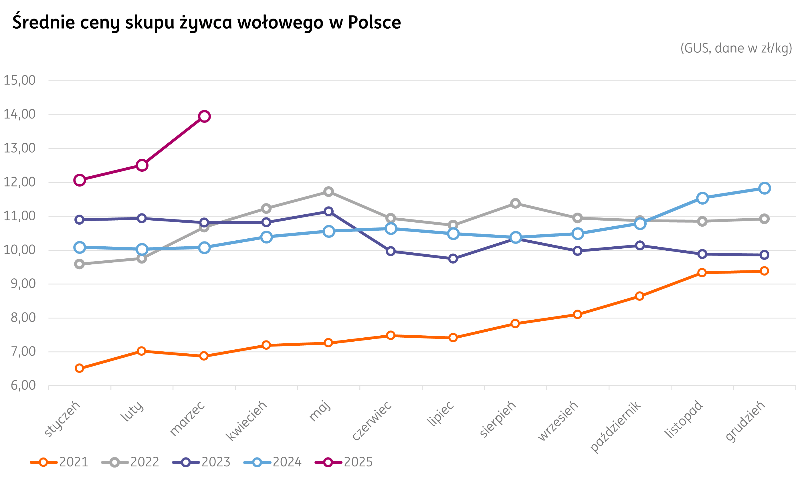 W marcu 2025 r. średnie stawki za bydło mięsne kolejny miesiąc z rzędu odnotowały wzrost. Cena 13,95 zł/kg jest 1,44 zł wyższa niż w lutym (+11,5%). W stosunku do zeszłego roku bieżący poziom jest wyższy o 38% (+3,87zł).