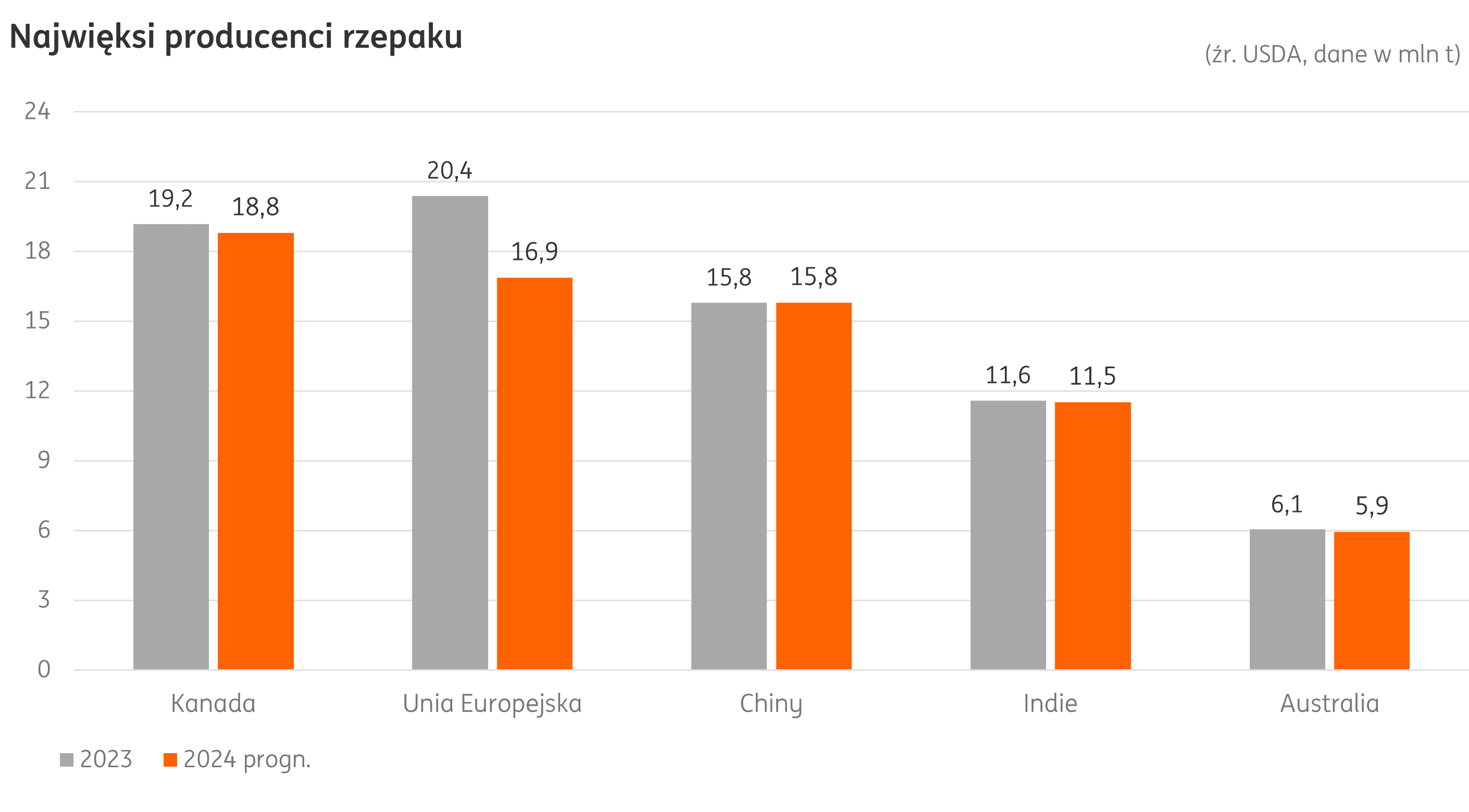 Prognoza zapasów końcowych po sezonie 2024/25 minimalnie spadła. Według USDA w kwietniowym raporcie, wolumen utrzymał się jednak powyżej 9 mln t. Bieżąca wartość pozostaje też znacznie niższa niż przed rokiem (zob. tab.). Spadki dotyczą wszystkich trzech największych producentów (UE, Kanady i Chin).