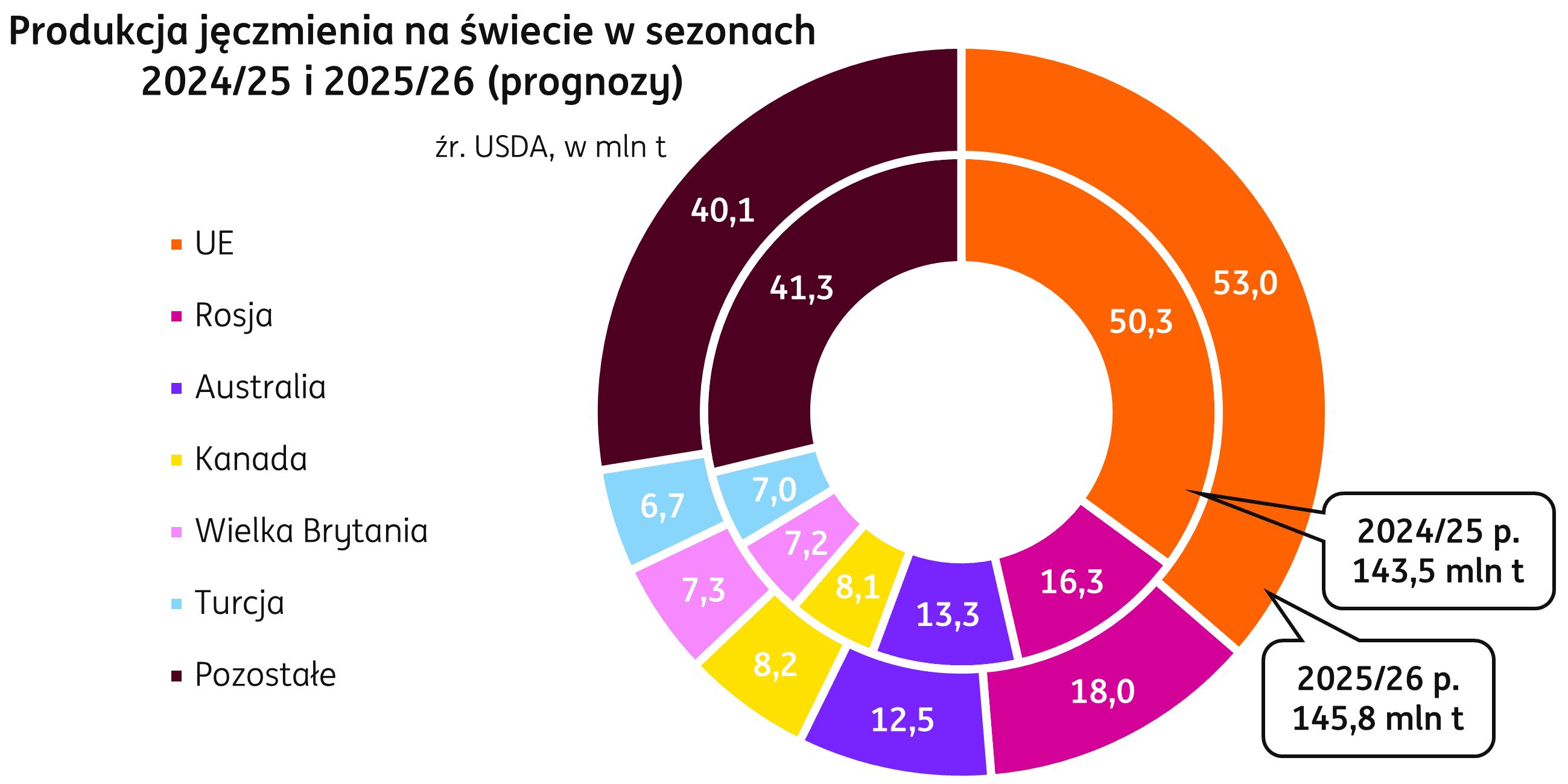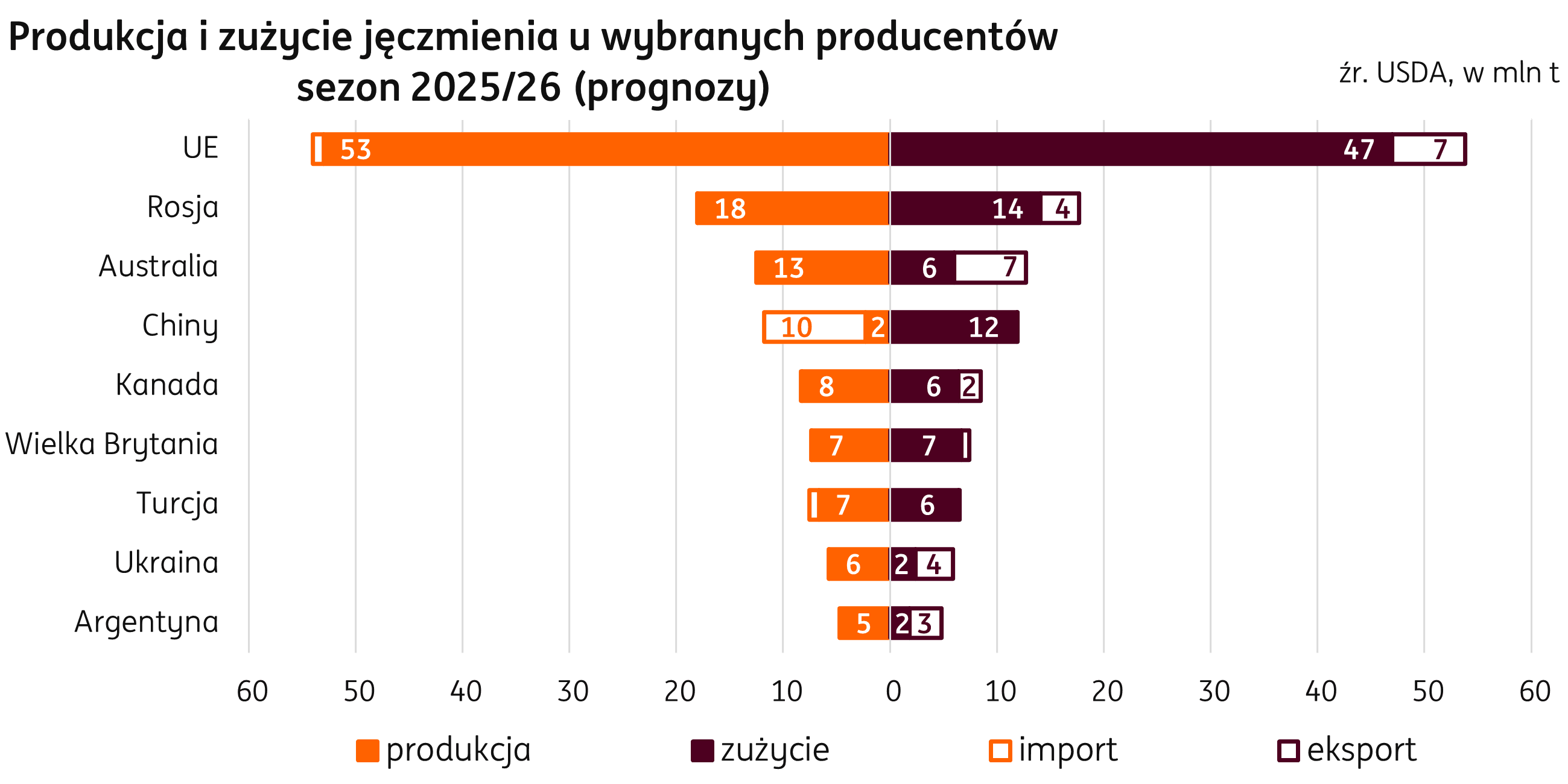 Świat. Produkcja jęczmienia w sezonie 2025/26 jest przez Departament Rolnictwa Stanów Zjednoczonych (USDA) prognozowana na poziomie 145,8 mln t, o 2,3 mln t powyżej zbiorów z sezonu 2024/25 (+1,6% r/r). Największa zmiana ma zajść dla największych globalnych producentów tego zboża: dla krajów UE, których zbiory mają wzrosnąć do poziomu 53,0 mln t, o 2,7 mln t w porównaniu do bieżącego sezonu. Rosja również ma zwiększyć swoją produkcję, o 1,8 mln w porównaniu do poprzedniego sezonu, do 18,0 mln t. Największy spadek produkcji jest prognozowany dla Australii (-0,8 mln t r/r) oraz Kazachstanu (-0,8 mln t r/r).