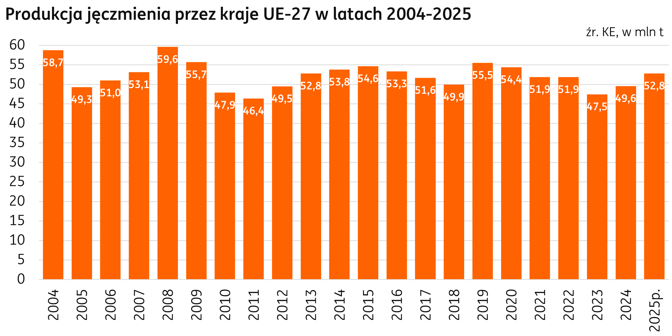 Unia Europejska. W majowej edycji raportów Komisji Europejskiej produkcja jęczmienia w 2025 r. jest prognozowana na poziomie 52,8 mln t, o 3,2 mln t więcej niż w ubiegłym roku. W porównaniu do kwietniowych prognoz, zbiory jęczmienia są przewidywane na poziomie o 0,6 mln t wyższym, a złożyły się na to m.in. zwiększona o 0,9 mln t produkcja w Hiszpanii, częściowo skompensowana przez obniżoną o 0,1 mln t w Szwecji. Polska produkcja jęczmienia jest na piątym miejscu wśród krajów UE, w 2025 zbiory są prognozowane na poziomie 3,3 mln t.
