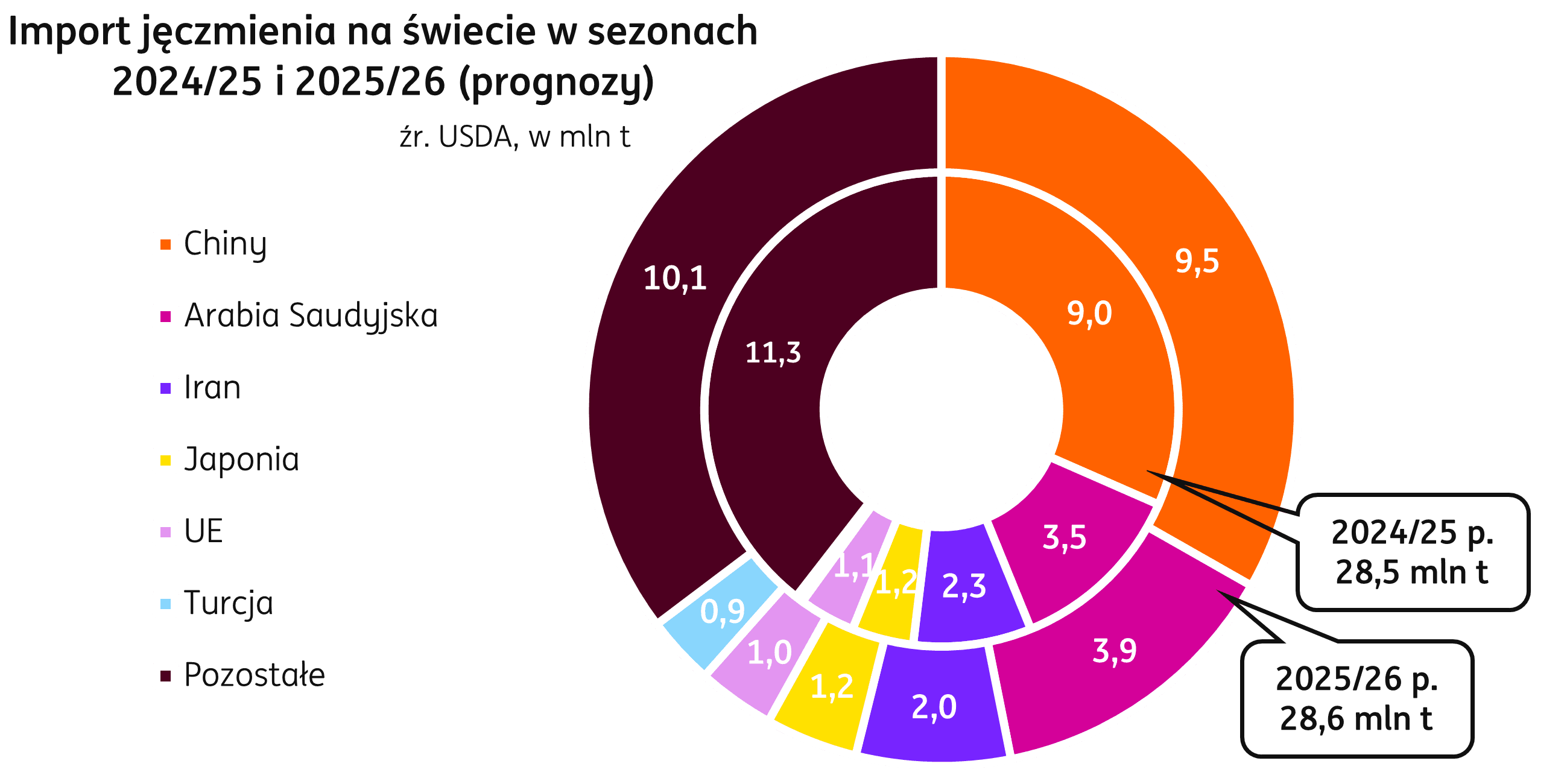 Bez zmian na pozycjach największych importerów jęczmienia, liderem pozostaną Chiny, a następna jest Arabia Saudyjska; wolumen dostaw do tych krajów ma zwiększyć się odpowiednio o 0,5 mln t i 0,4 mln t w relacji do poprzedniego sezonu. Turcja zaimportuje o 0,8 mln t więcej niż w poprzednim sezonie, natomiast największy spadek będzie miał mniejsze w Iranie, tam dotrą dostawy o wolumenie niższym o 0,3 mln t r/r.