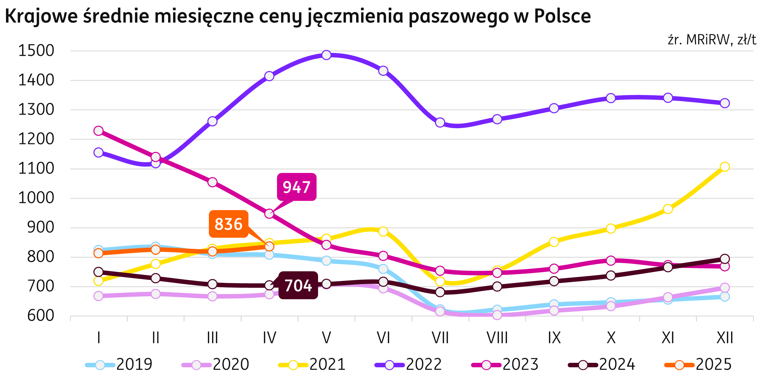 Ceny. Kwietniowa średnia cena jęczmienia paszowego w Polsce, według Biuletynu MRIRW, zanotowała miesięczny wzrost w wysokości 2% m/m, osiągając 836 zł/t, to 19% więcej niż przed rokiem. Na rynku krajowym 25 maja 2025 r. średnie ceny jęczmienia paszowego kształtowały się w przedziale 819-872 zł/t.