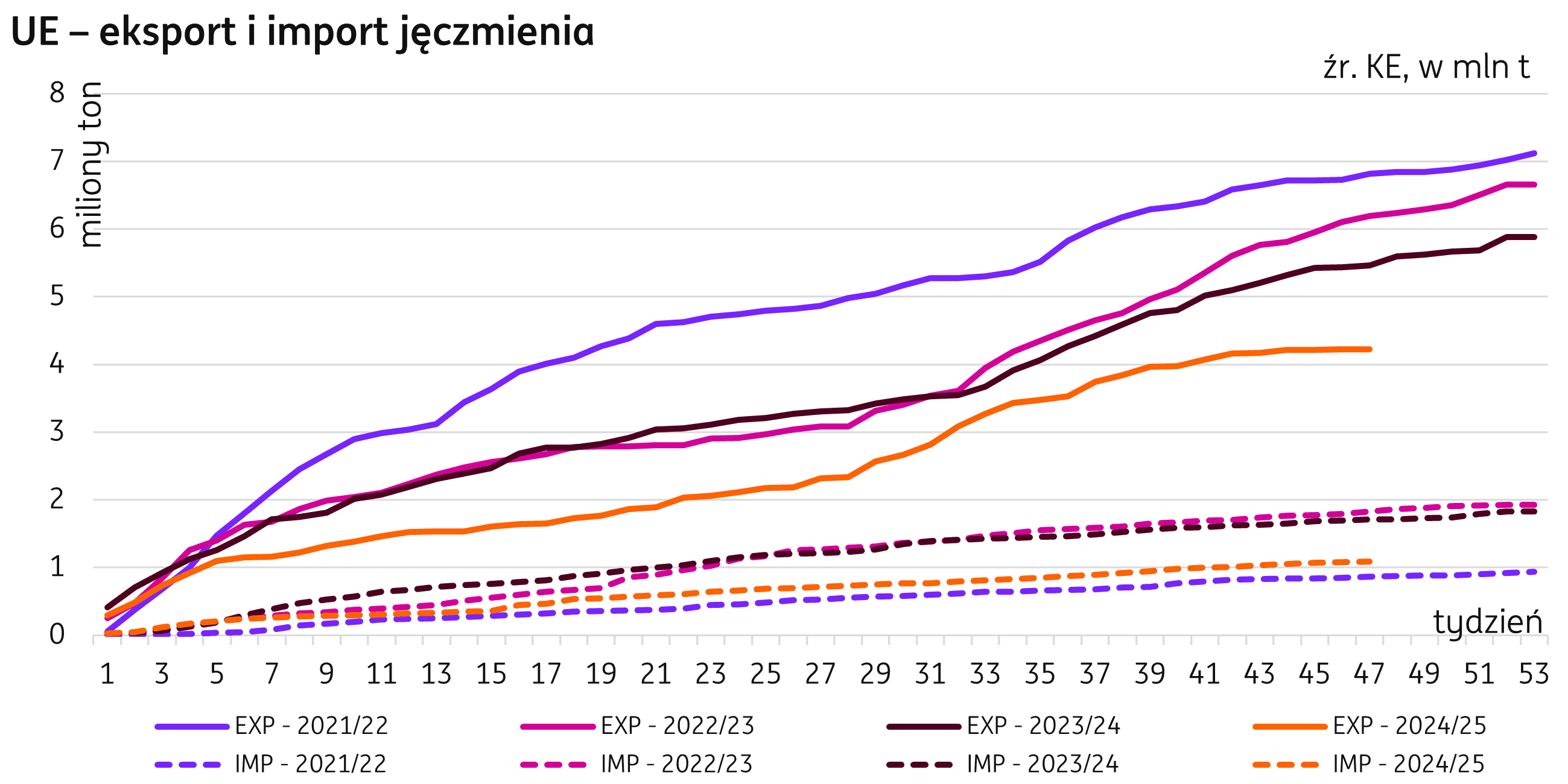 Świat. W ujęciu globalnym, wolumen handlu jęczmieniem pozostaje na poziomie porównywalnym do poprzedniego sezonu i, według raportów USDA, w 2025/26 ma osiągnąć 28,6 mln t (+78 tys. t r/r). Kraje Unii Europejskiej mają osiągnąć pozycję lidera w eksporcie jęczmienia i wyprzedzą Australię po raz pierwszy od sezonu 2020/21, eksportując 6,8 mln t (+0,7 mln t r/r). Eksport jęczmienia z Australii ma spaść do 6,7 mln t (-0,5 mln t r/r), co odpowiada obniżonej produkcji w tym kraju.