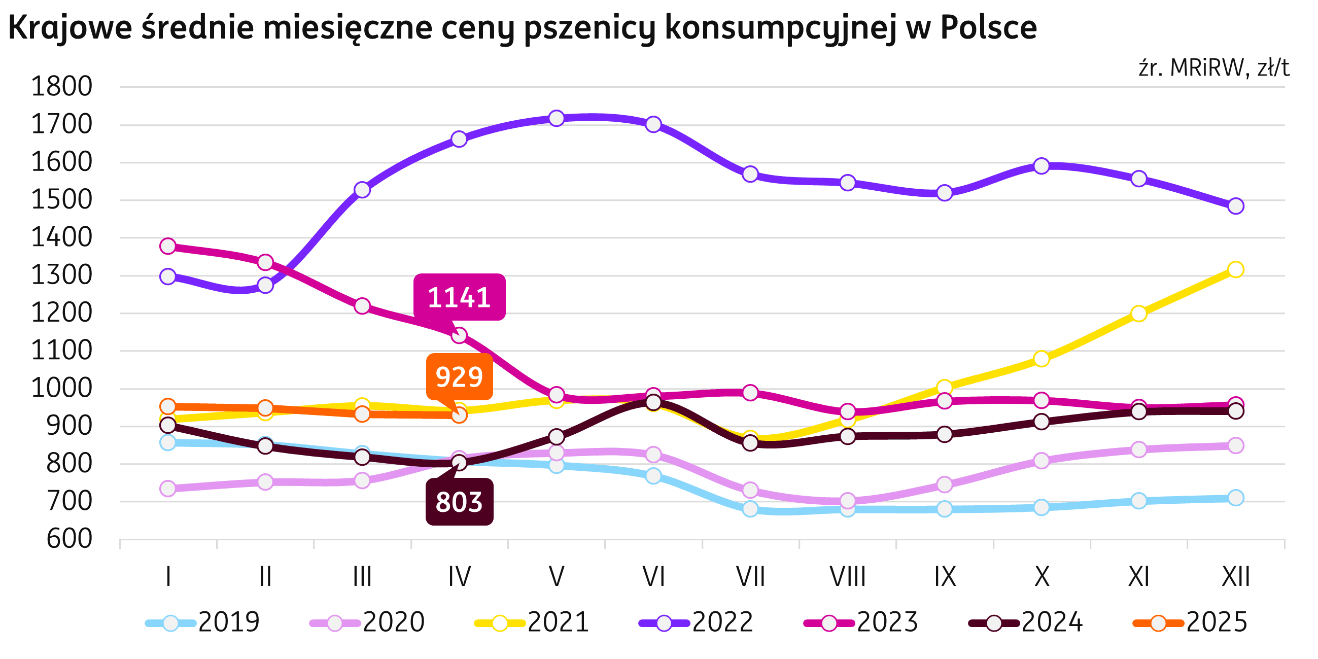 Cena. Średnia cena pszenicy konsumpcyjnej w Polsce spadła w kwietniu o 2 zł/t, do 929 zł/t (dane wg biuletynu MRIRW). W porównaniu do kwietnia ubiegłego roku, cena jest wyższa o 126 zł/t (+16% r/r). Na rynku krajowym 25 maja 2025 r. średnie ceny pszenicy konsumpcyjnej kształtowały się w przedziale 824-955 zł/t.
