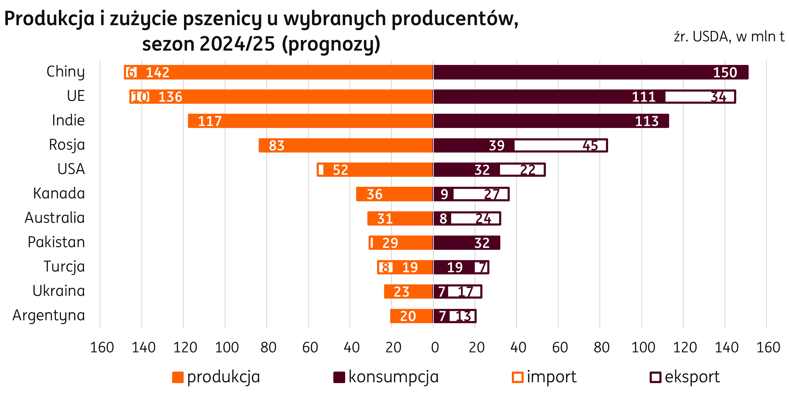 Bez zmian również na pozycjach największych importerów pszenicy, liderem pozostanie Egipt, a następna jest Indonezja, wolumen dostaw do tych krajów ma zwiększyć się o 0,5 mln t w relacji do poprzedniego sezonu. Kraje UE zaimportują o 1,2 mln t mniej niż w poprzednim sezonie. Największe zmiany natomiast mają zajść w przypadku Turcji, która ma zwiększyć import o 4,0 mln t r/r, a także Chin, które wprawdzie mają zwiększyć dostawy pszenicy o 2,7 mln t r/r, ale wciąż pozostaną one na niskim poziomie 6,0 mln t, co plasuje ten kraj na jedenastym miejscu pod względem wolumenu wśród importerów pszenicy w bieżących raportach USDA.