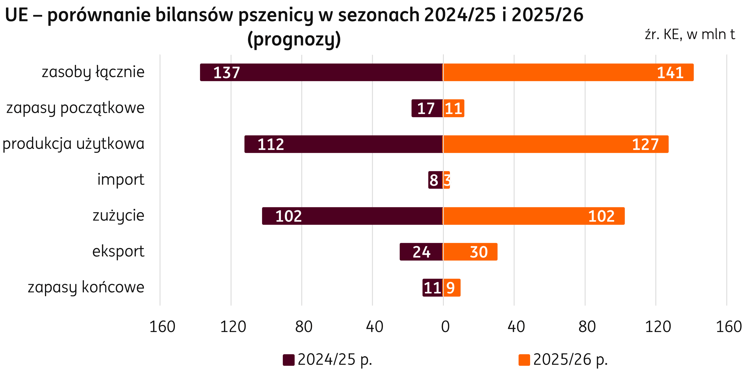 Pierwsze globalne prognozy pszenicy USDA w sezonie 2025/26 zakładają spory wzrost zbiorów w porównaniu do poprzedniego sezonu, głównie za sprawą odbudowy produkcji w krajach Unii Europejskiej. Warunki atmosferyczne w poprzednim sezonie były wyzwaniem nie tylko dla polskich rolników, ale również dla niemieckich, czy francuskich. Bieżący sezon agrotechniczny jest oceniany jako bardziej korzystny dla roślin, ale nie idealny, szczególnie pod względem deficytu opadów stwierdzanego w komunikatach Instytutu Uprawy Nawożenia i Gleboznawstwa (IUNG). To, w jakim stopniu prognozy zbiorów zostaną zrealizowane, zależy teraz przede wszystkim od warunków atmosferycznych w najbliższych tygodniach.