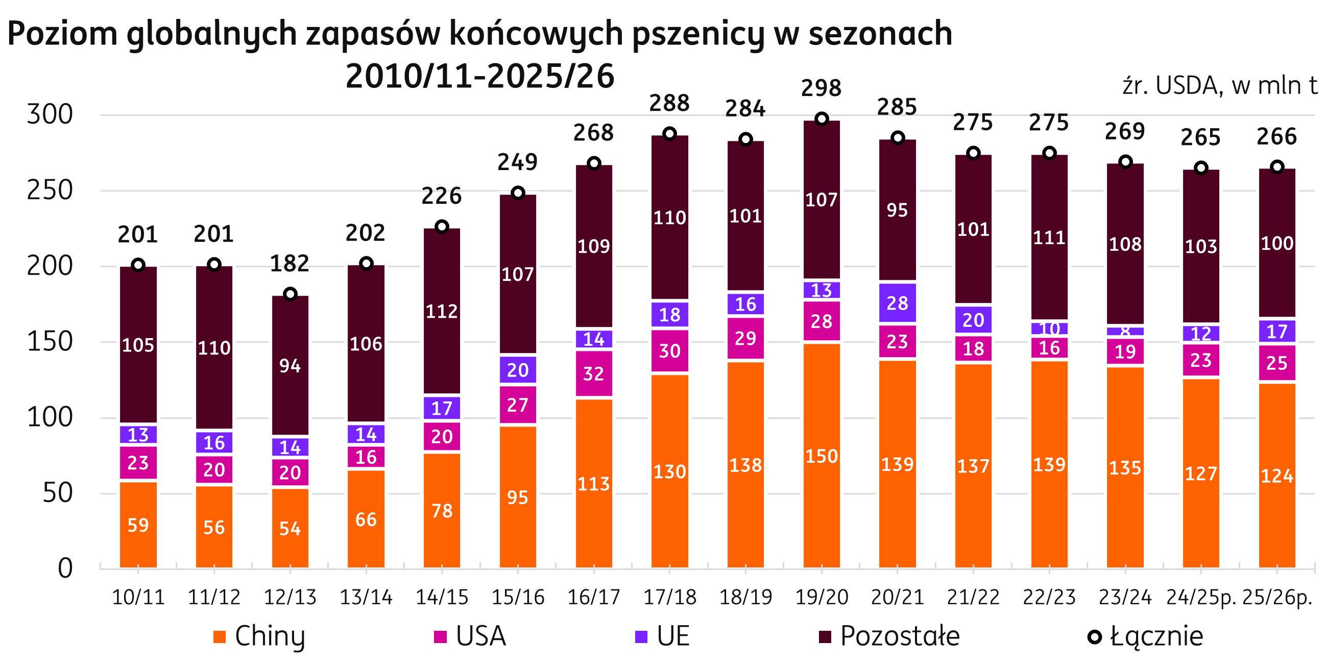 Świat. Podniesiona produkcja i podążająca za nią konsumpcja w najnowszych prognozach USDA powodują niewielką zmianę w wolumenie zapasów końcowych, jakimi ma się zakończyć sezon 2025/26. Maja one osiągnąć 265,7 mln t, o 0,5 mln t więcej niż w poprzednim sezonie. Popyt przekraczający produkcję w Chinach przy obniżonym imporcie pszenicy ma przyczynić się do spadku zapasów końcowych do 123,9 mln t (-3,0 mln t r/r), które będą w bieżących prognozach odpowiadały 47% światowych zapasów. Z nadwyżką ma to zostać skompensowane przez zapasy w krajach UE, której mają wzrosnąć o 4,5 mln t w ujęciu rocznym. Spory wzrost jest również przewidywany w USA (+2,2 mln t r/r).