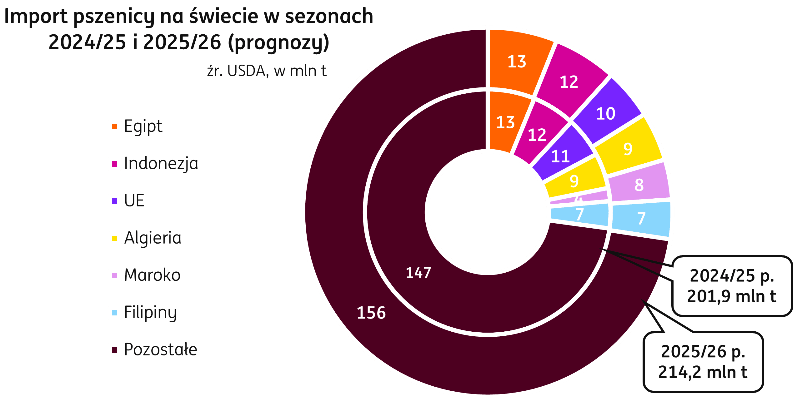 Świat. Produkcja pszenicy w sezonie 2025/26 jest przez Departament Rolnictwa Stanów Zjednoczonych (USDA) prognozowana na rekordowym poziomie 808,5 mln t, o 1,1% powyżej zbiorów z sezonu 2024/25. Największa zmiana jest prognozowana dla krajów UE, których produkcja ma odbudować się do poziomu 136,0 mln t, o 13,9 mln t w porównaniu do bieżącego sezonu, a o 0,6 mln t poniżej produkcji sprzed dwóch lat. Na pozycji największych producenta pszenicy na świecie umacniają się Chiny, zbiory w tym kraju są prognozowane na poziomie 142,0 mln t (+1,9 mln t r/r). Indie również mają zwiększyć produkcję, do 117,0 mln t (+3,7 mln t r/r).
