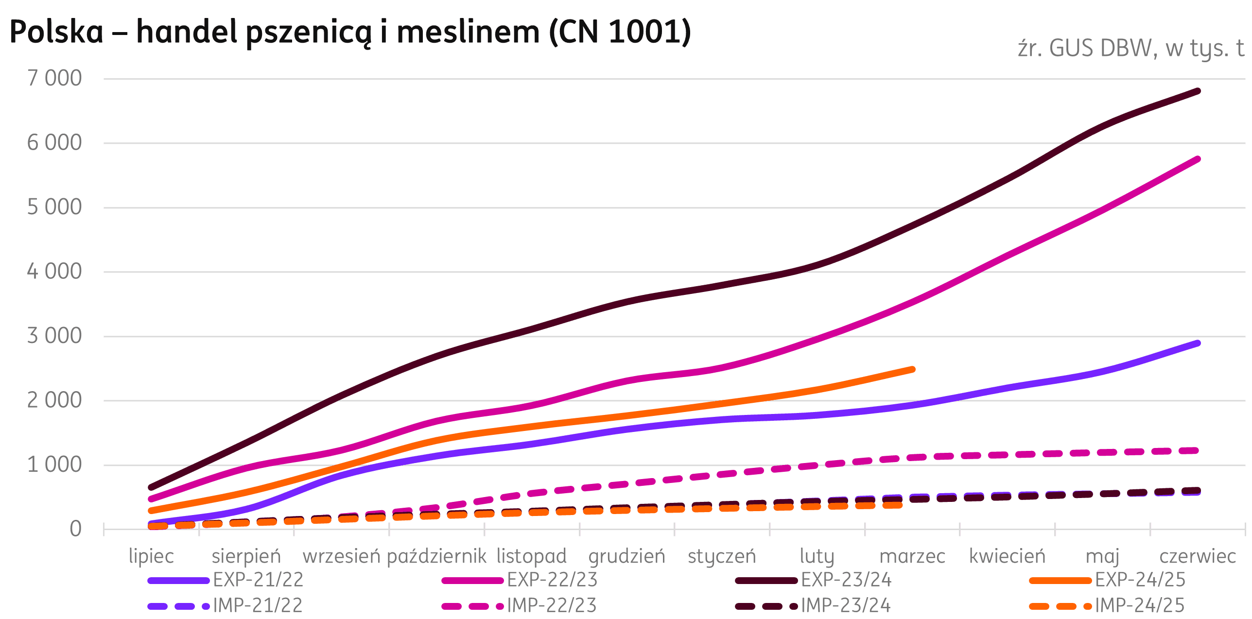 Handel. Po trzech kwartałach sezonu 2024/25 eksport pszenicy spadł do 4 718 tys. t, o 47% poniżej poziomu ubiegłorocznego. Tylko w marcu eksport pszenicy był o 48% niższy niż w ubiegłym roku przy wolumenie 317 tys. t. Import również utrzymuje się na poziomie niższym od ubiegłorocznego z wolumenem 464 tys. t (-17% r/r), a w samym marcu osiągnął 25 tys. t, o 20% mniej niż przed rokiem.