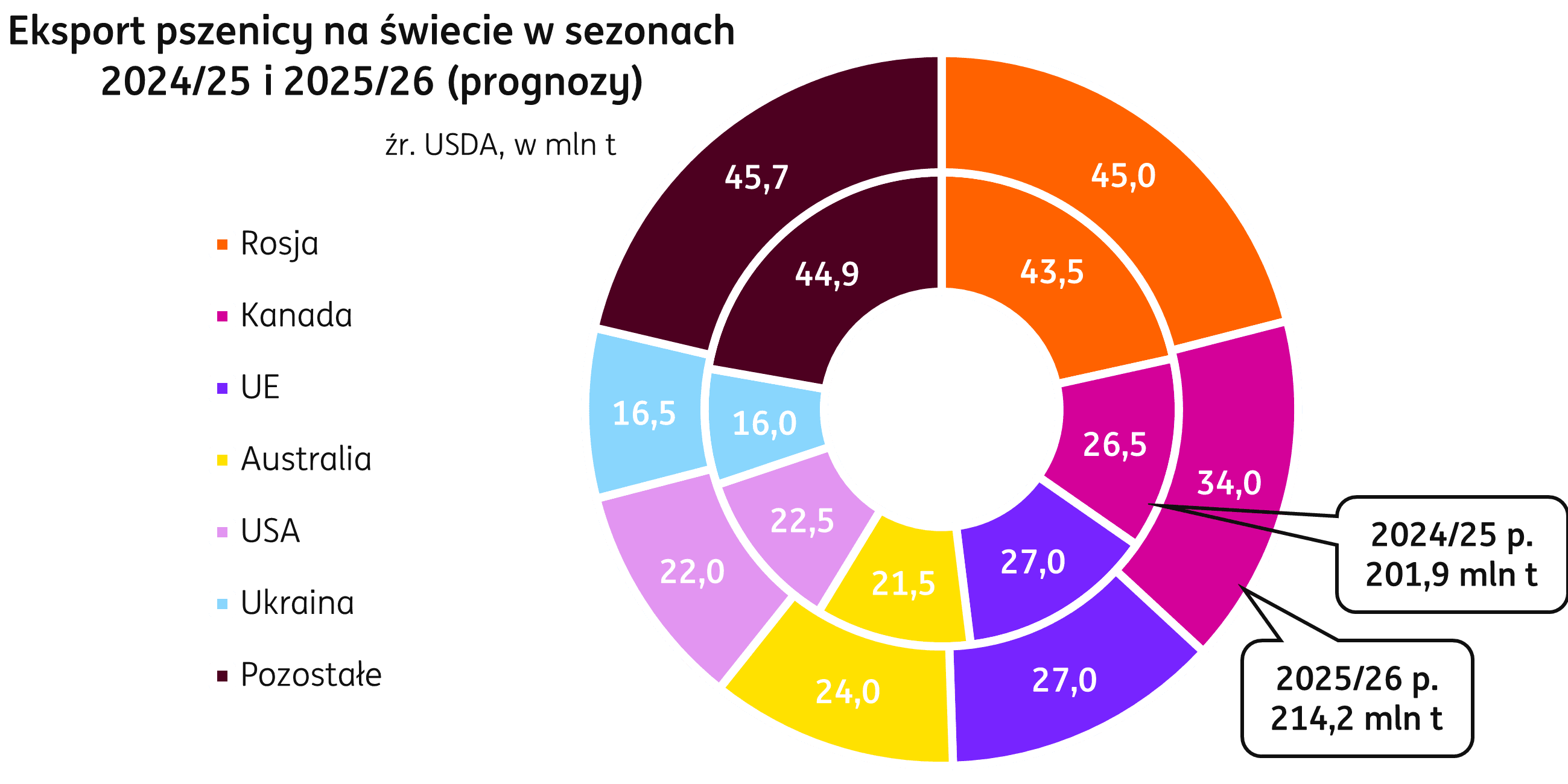 Świat. Wraz z prognozowanym wzrostem produkcji, zwiększony został przewidywany w sezonie 2025/26 przez USDA wolumen handlu pszenicą. Przyszły sezon ma przynieść wzrost poziomu handlu o 12,3 mln t w porównaniu do kończącego się sezonu, do 214,2 mln t. Rosja ma pozostać największym eksporterem z wolumenem podniesionym o 1,5 mln t r/r, a większa produkcja przyczyni się do zwiększenia eksportu przez kraje UE o 7,5 mln t. Istotne zmiany mają mieć miejsce w przyszłym sezonie także w Argentynie i Australii, których eksport zwiększy się odpowiednio o 3,0 mln t r/r i 2,5 mln t r/r. Spaść ma natomiast wolumen dostaw z Kazachstanu (-2,0 mln t r/r).