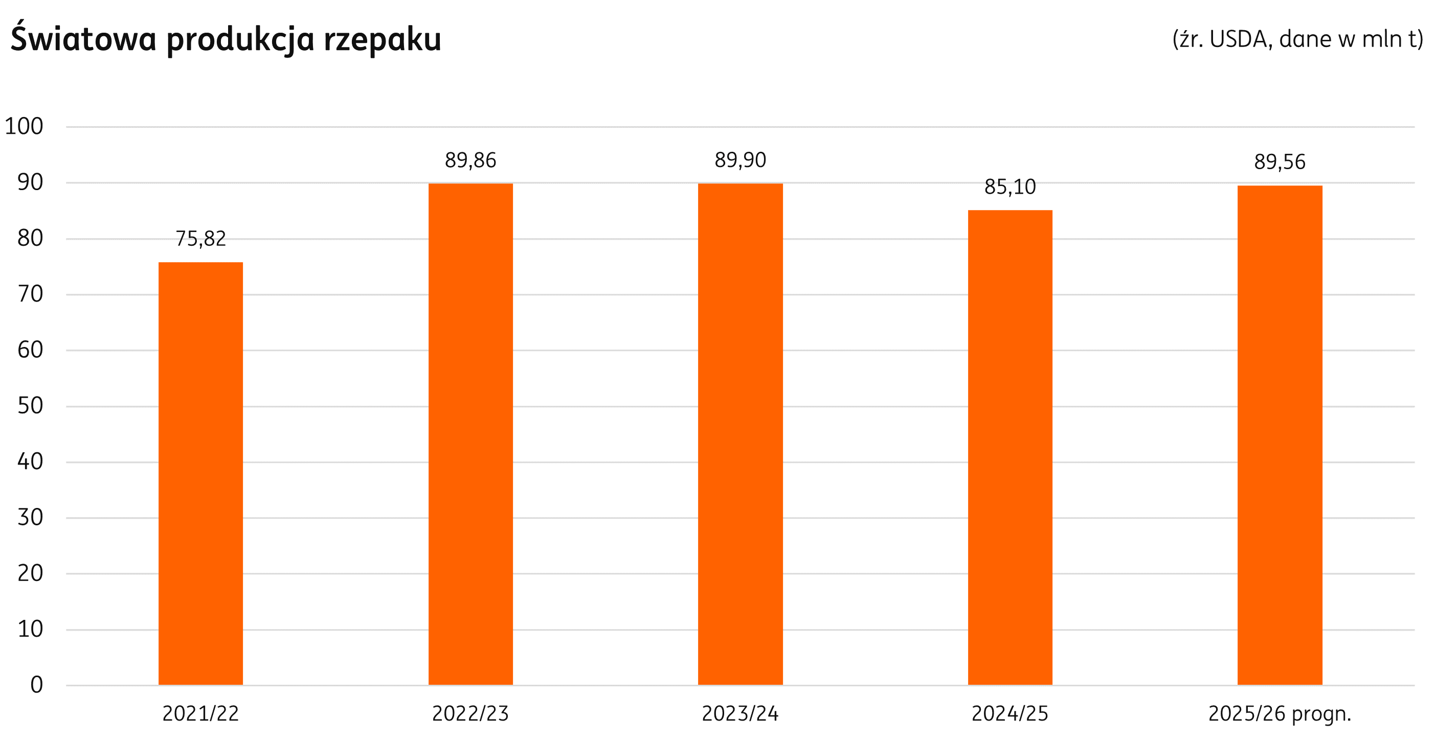 Prognoza zapasów końcowych po sezonie 2025/26 wyróżniła się najmniejszą zmianą w stosunku do wcześniejszego okresu. Według USDA w majowym raporcie, wolumen ma utrzymać się powyżej 9 mln t. Wartość stabilizuje się po wcześniejszej dużej zmianie i spadku z 11,5 mln t na przełomie sezonów 2023/24 i 2024/25. Wtedy korekta wynika z redukcji wolumenu w Chinach, Kanadzie i UE.