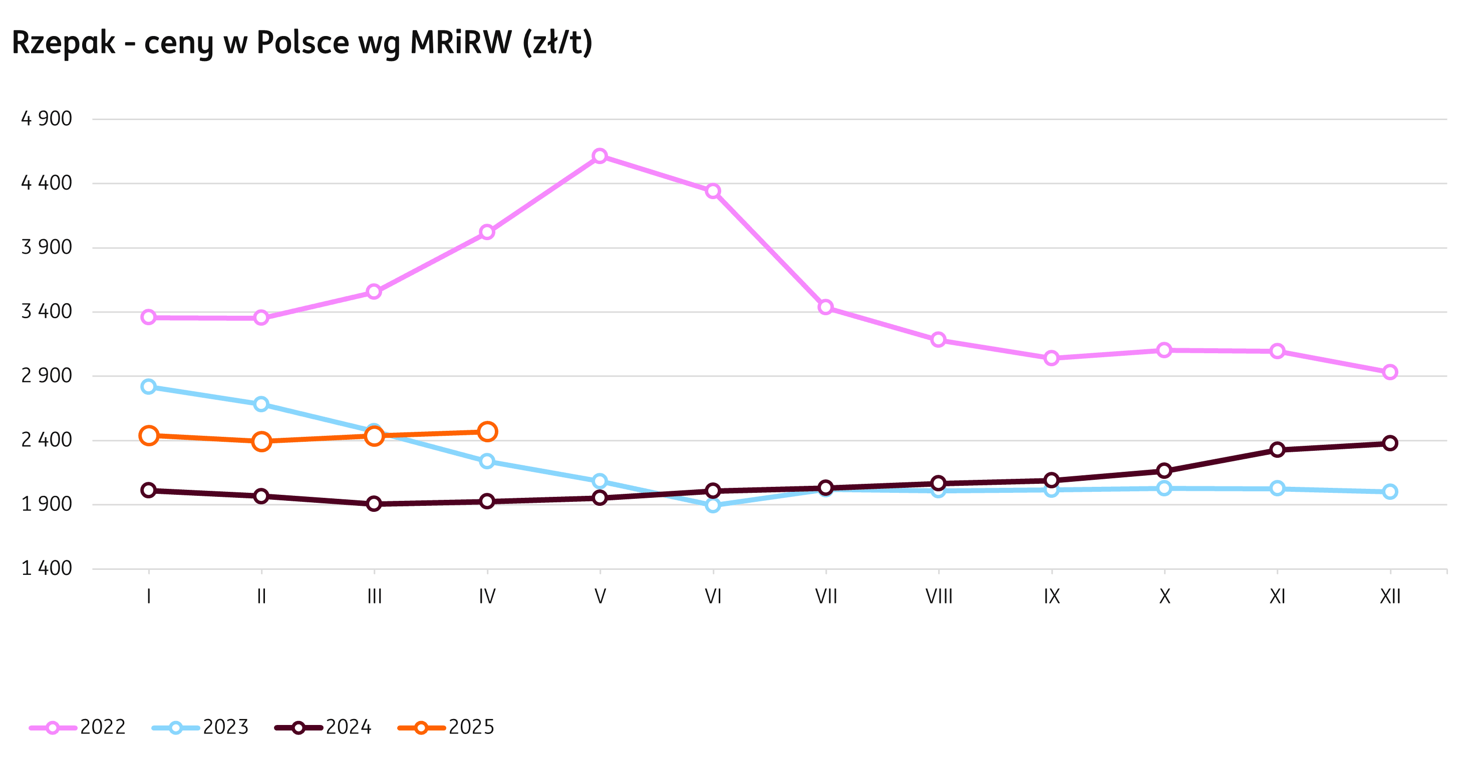 W tygodniu kończącym się 25 maja 2025 r. średnie stawki za rzepak wyniosły 2375 zł/t zgodnie z danymi MRiRW. W porównaniu z wcześniejszym tygodniem jest to spadek o 58 zł (2,4%). W stosunku do zeszłego roku bieżące ceny są o 21% wyższe.