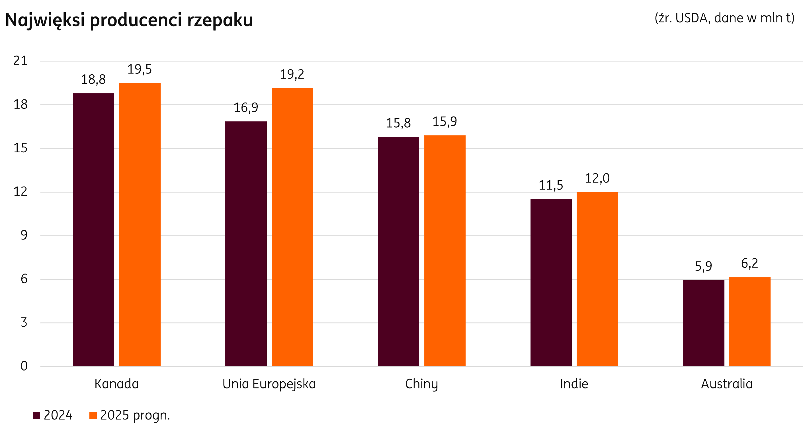 Świat: Globalny eksport jest jedynym parametrem, u którego prognozowany jest spadek w nadchodzącym sezonie 2025/26. Wolumen będzie niższy głównie z powodu zmniejszonych wysyłek nasion z Kanady, a także niższego zapotrzebowania importowego Unii Europejskiej, która spodziewa się znaczącego wzrostu wewnętrznej produkcji. .