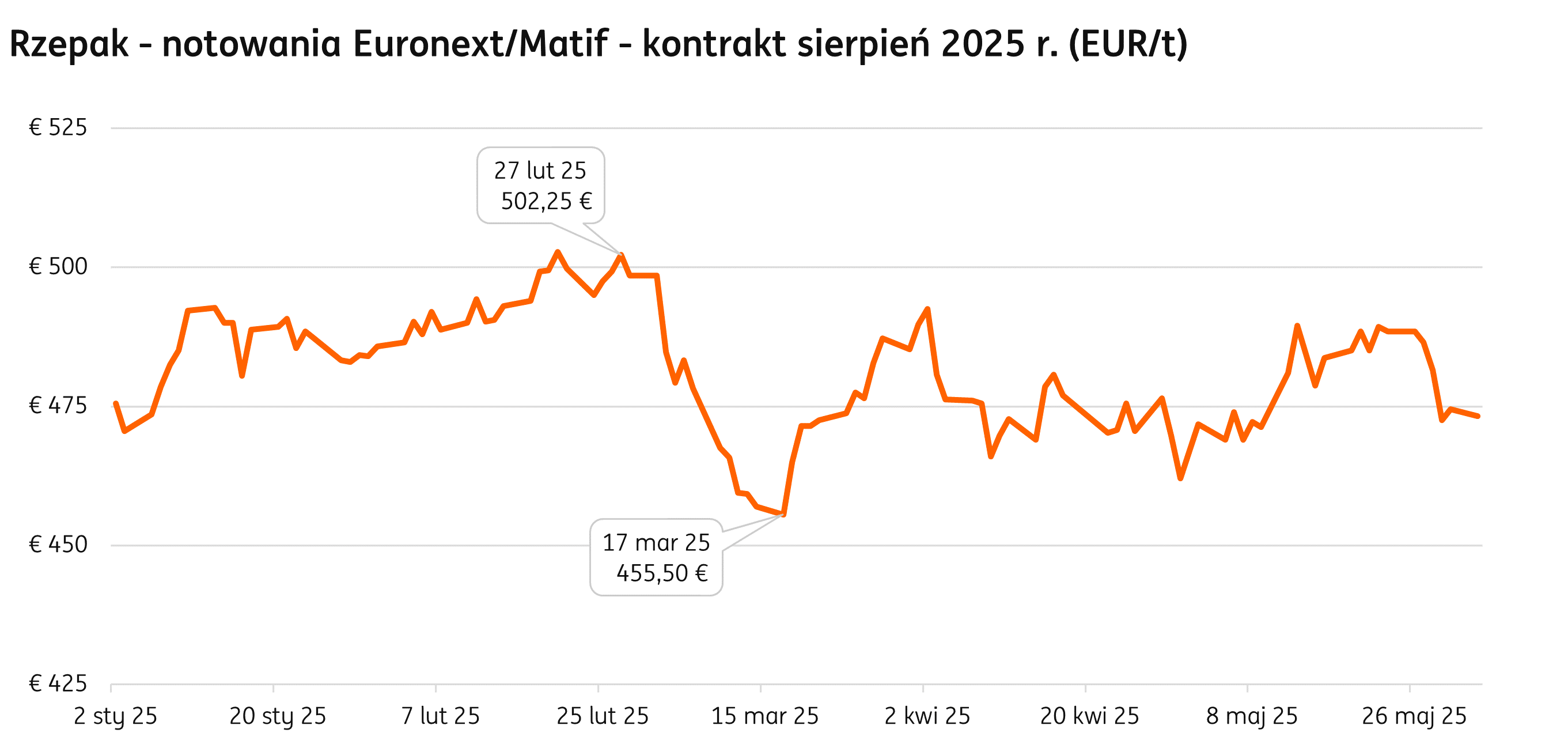 Najbliższym na Euronext/Matif stał się kontrakt sierpniowy, czyli pierwszy na nowe zbiory. Notowania były dość zmienne, na przestrzeni miesiąca wahania sięgały 20 EUR. W kwietniu kształtowały się między 480, a 460 EUR.