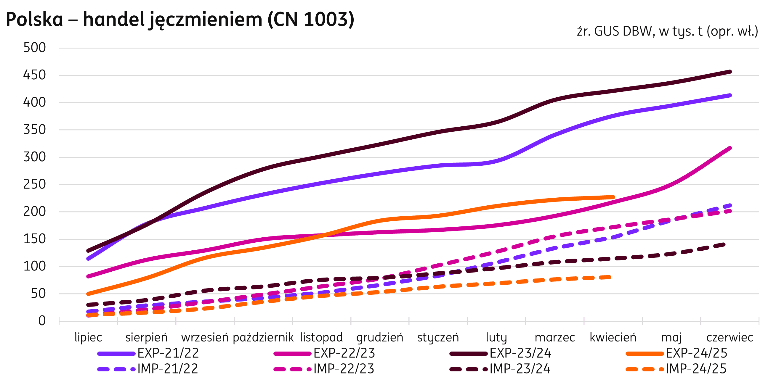 Handel. Po dziesięciu miesiącach sezonu 2024/25 eksport jęczmienia spada do 227 tys. t, o 46% poniżej poziomu ubiegłorocznego. W kwietniu eksport jęczmienia był niższy o 70% od ubiegłego z tego okresu, osiągając 5 tys. t. Import od początku sezonu również pozostaje na poziomie niższym od ubiegłorocznego z wolumenem 81 tys. t (-32% r/r), a tylko w kwietniu osiągnął 4 tys. t, o 32% niżej niż przed rokiem.