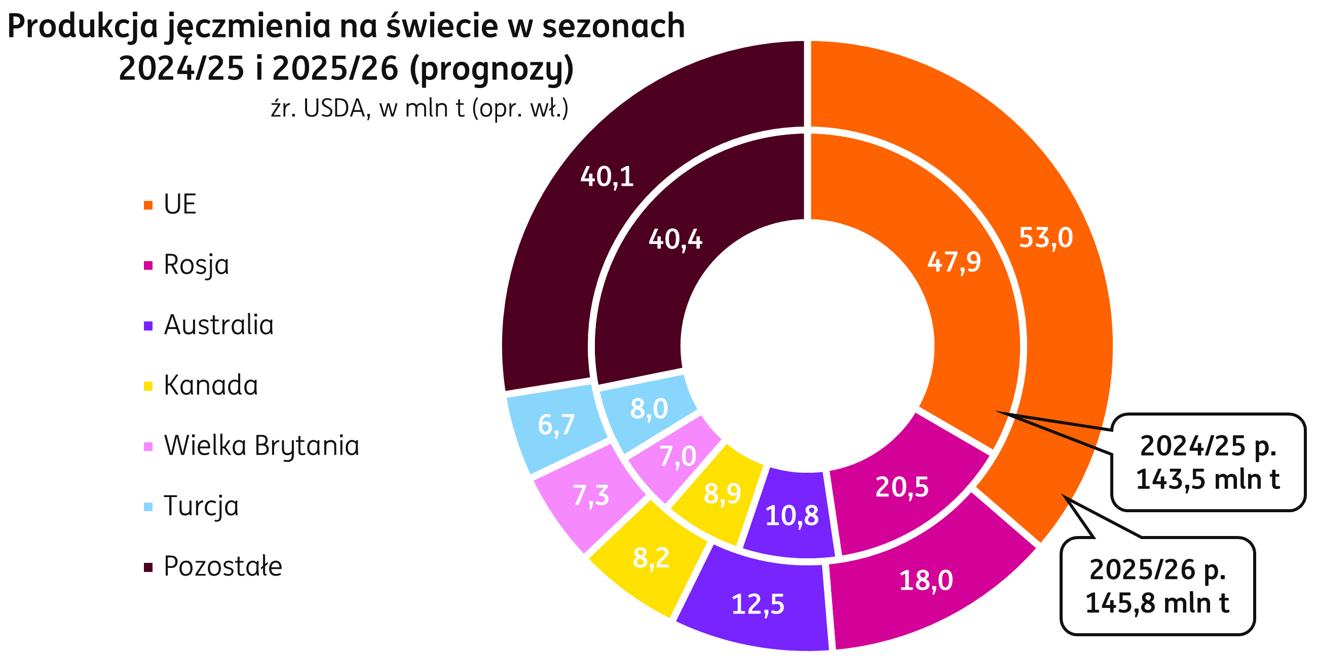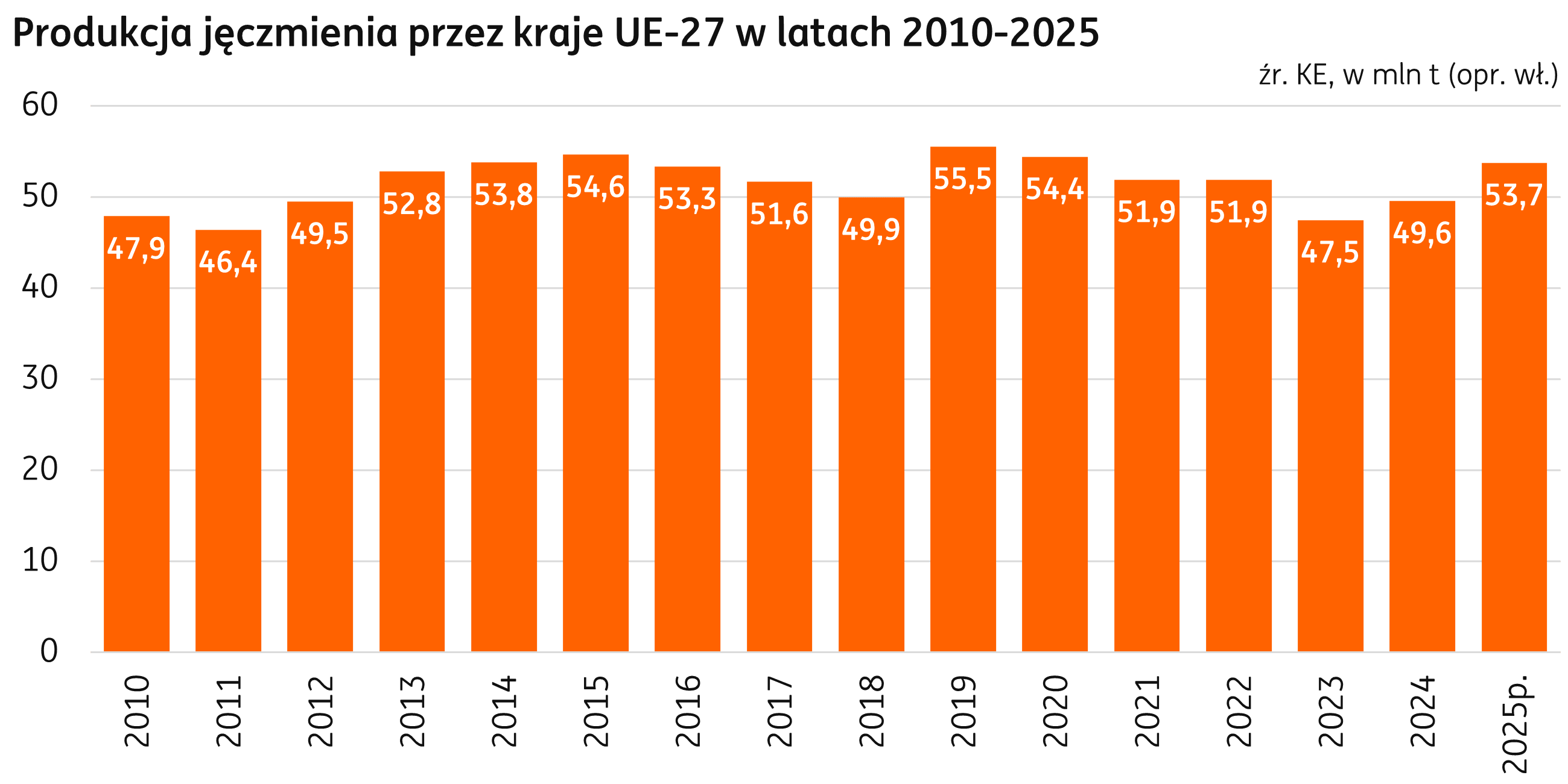 Unia Europejska. W czerwcowej edycji raportów Komisji Europejskiej produkcja jęczmienia w 2025 r. jest prognozowana na poziomie 53,7 mln t, o 4,2 mln t powyżej ubiegłego roku. W porównaniu do majowych prognoz, zbiory jęczmienia są przewidywane na poziomie o 1,0 mln t wyższym, a złożyła się na to m.in. zwiększona o 0,6 mln t produkcja w Hiszpanii, a także zbiory we Francji i Rumuni oczekiwane na poziomie o 0,1 mln wyższym. Polska produkcja jęczmienia jest na piątym miejscu wśród krajów UE, w 2025 zbiory są prognozowana na poziomie 3,3 mln t.