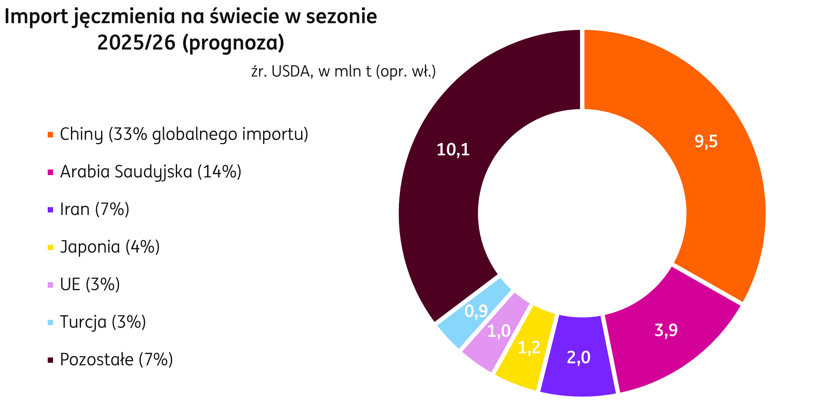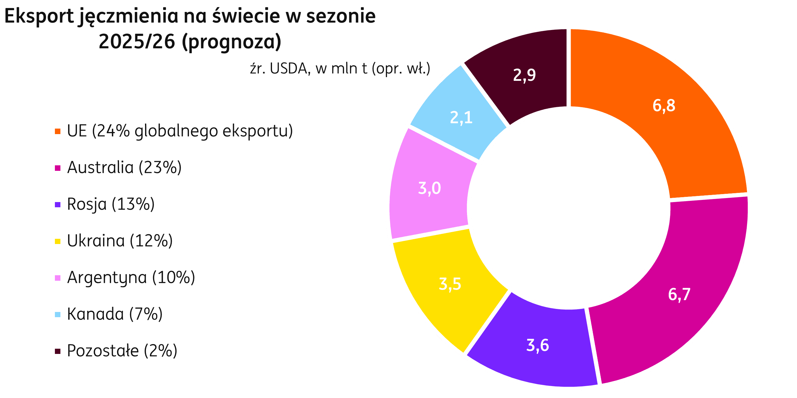 Świat. Wolumen handlu według raportów USDA w sezonie 2025/26 ma wynieść 28,7 mln t, o 0,4% poniżej poziomu notowanego w sezonie 2024/25. Kraje Unii Europejskiej mają osiągnąć pozycję lidera w eksporcie jęczmienia i mają wyprzedzić Australię po raz pierwszy od sezonu 2020/21, eksportując 6,8 mln t (+0,7 mln t r/r). Eksport jęczmienia z Australii ma spaść do 6,7 mln t (-0,5 mln t r/r), co odpowiada obniżonej produkcji w tym kraju. Bez zmian na pozycjach największych importerów jęczmienia, liderem pozostaną Chiny, a następna jest Arabia Saudyjska, wolumen dostaw do tych krajów ma zwiększyć się odpowiednio o 0,5 mln t i 0,4 mln t w relacji do poprzedniego sezonu.