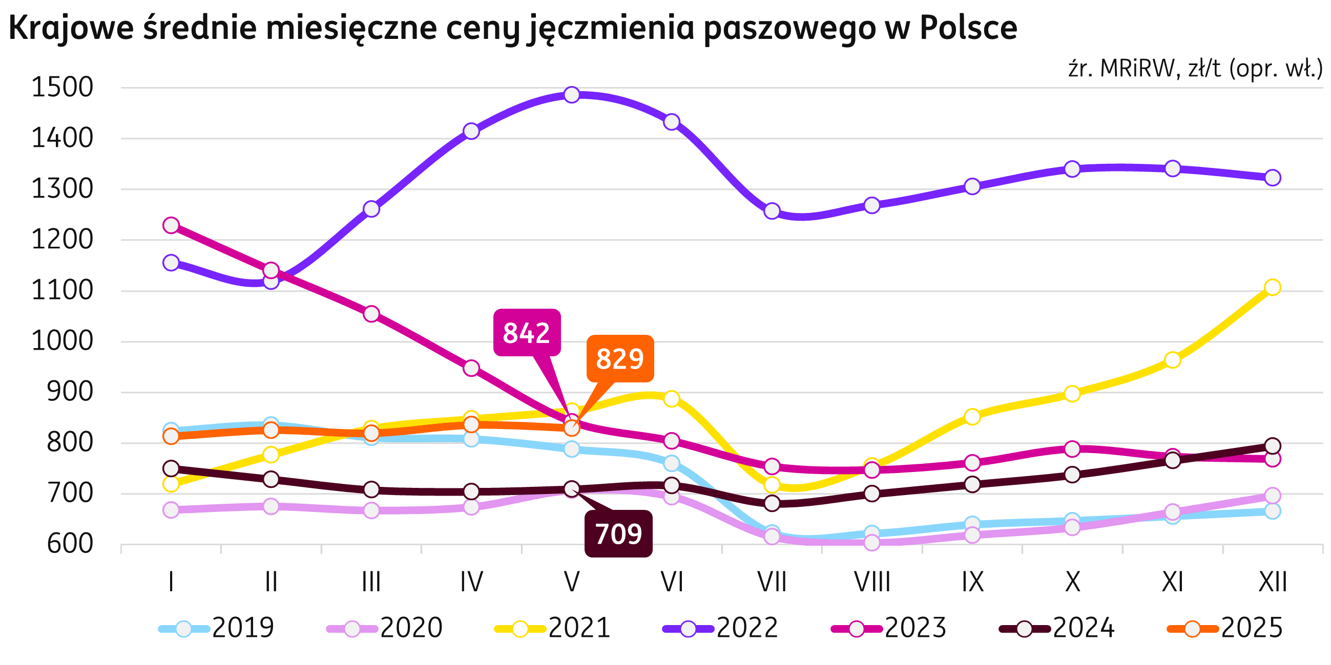 Ceny. Majowa średnia cena jęczmienia paszowego w Polsce, według Biuletynu MRIRW, zanotowała miesięczny spadek w wysokości 0,8% m/m, osiągając 829 zł/t, to 17% więcej niż przed rokiem. Na rynku krajowym w tygodniu kończącym się 22 czerwca 2025 r. średnie ceny jęczmienia paszowego kształtowały się w przedziale 799-862 zł/t.