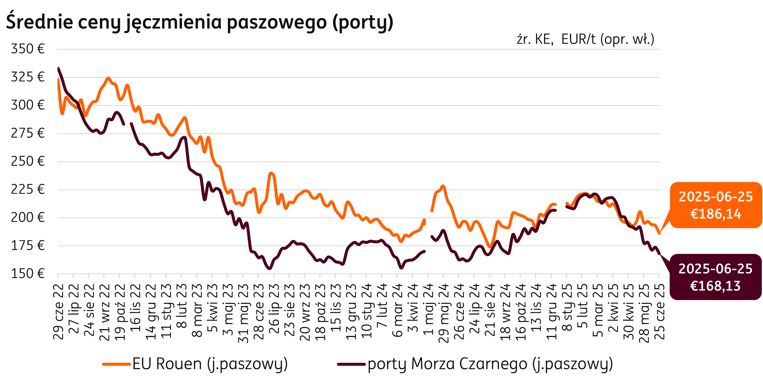 W ostatnim tygodniu czerwca w Rouen (Francja) notowania jęczmienia paszowego spadły w ujęciu miesięcznym o 5% i 25 czerwca 2025 r. wyniosły 186 EUR/t, to o 3% poniżej poziomu ubiegłorocznego. W portach Morza Czarnego cena 168 EUR/t również oznacza spadek o 5% w ciągu miesiąca, ale motowania kształtują się o 3% wyżej niż rok wcześniej.