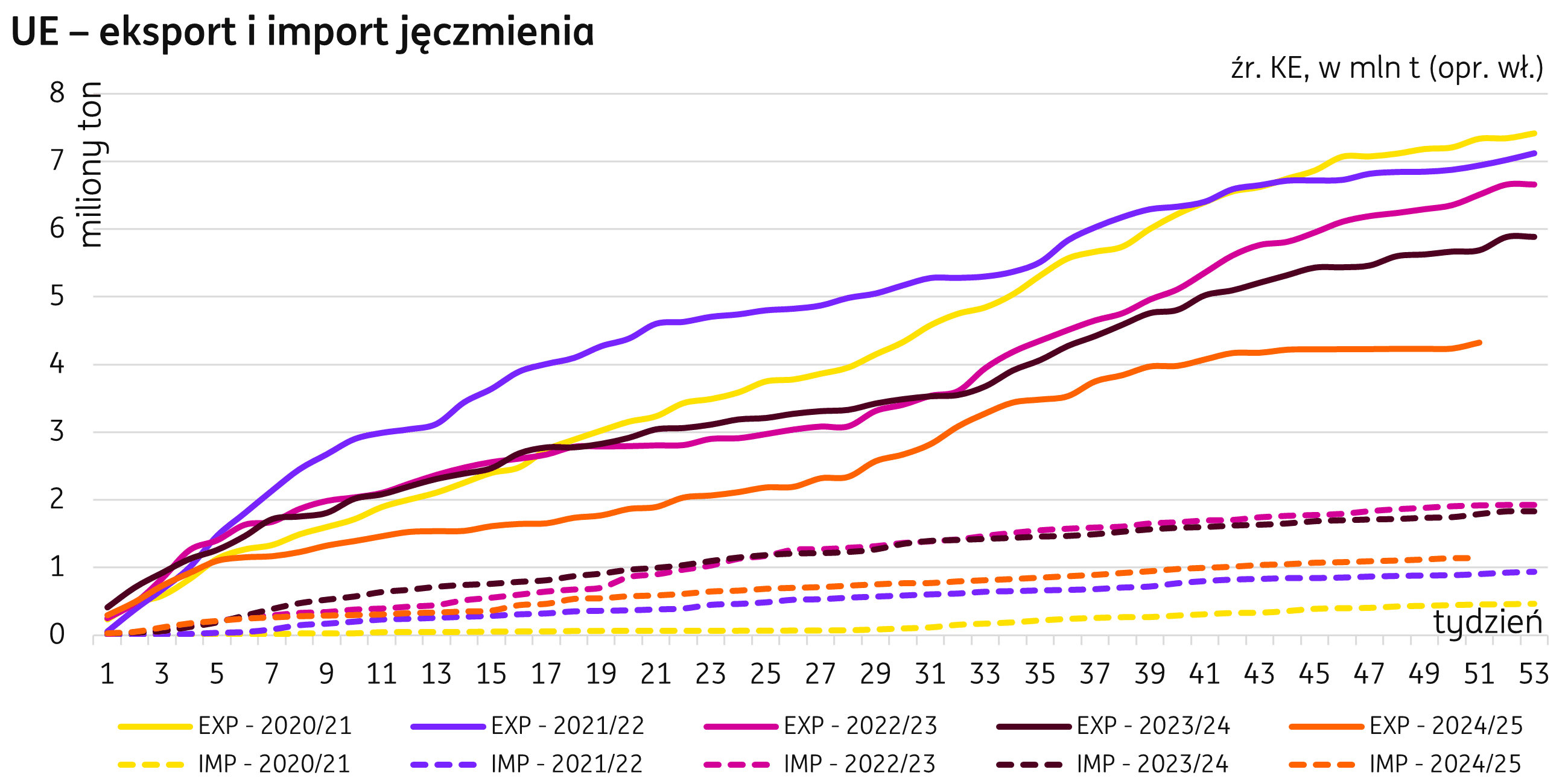 Unia Europejska. Opublikowane przez KE wstępne dane wskazują, że po upływie pięćdziesięciu jeden tygodni sezonu 2024/25 eksport jęczmienia z krajów UE do 22 czerwca 2025 r., osiągnął 4,3 mln t, to mniej o 24% (-1,4 mln t r/r), w porównaniu do analogicznego okresu poprzedniego sezonu. Głównym odbiorcą europejskiego jęczmienia w analizowanym okresie była Arabia Saudyjska (24% udziału w eksporcie jęczmienia, 1,0 mln t) oraz Maroko (14%, 0,7 mln t). Import jęczmienia w analizowanym okresie był niższy o 40% (-50 tys. t r/r) od ubiegłorocznego z tego okresu, osiągając poziom 174 tys. t, największym dostawcą jęczmienia do UE były Wielka Brytania (46% importu, 0,5 mln t) oraz Ukraina (37% importu, 0,4 mln t).
