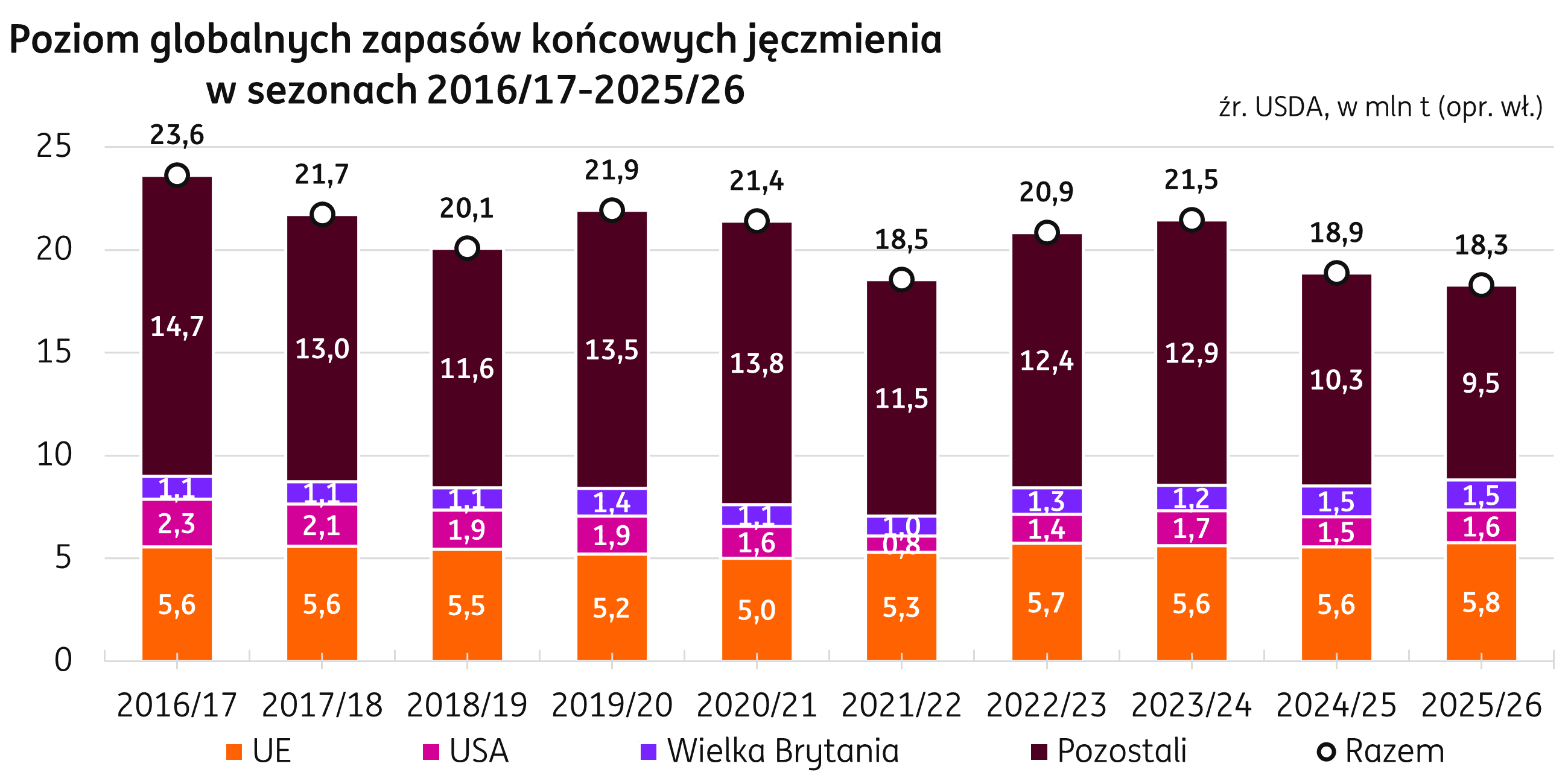Świat. W najnowszych prognozach USDA zapasy jęczmienia kończące sezon 2025/26 są prognozowane na poziomie 18,3 mln t, o 0,6 mln t niżej niż w poprzednim sezonie. Kraje Unii Europejskiej mają na koniec sezonu zgromadzić 5,8 mln t jęczmienia, co stanowi 32% światowych zapasów. Kolejne są Stany Zjednoczone z wolumenem 1,6 mln t, posiadające 9% udziału oraz Wielka Brytania z zapasami 1,5 mln t i ośmioprocentowym udziałem w globalnych zapasach końcowych.