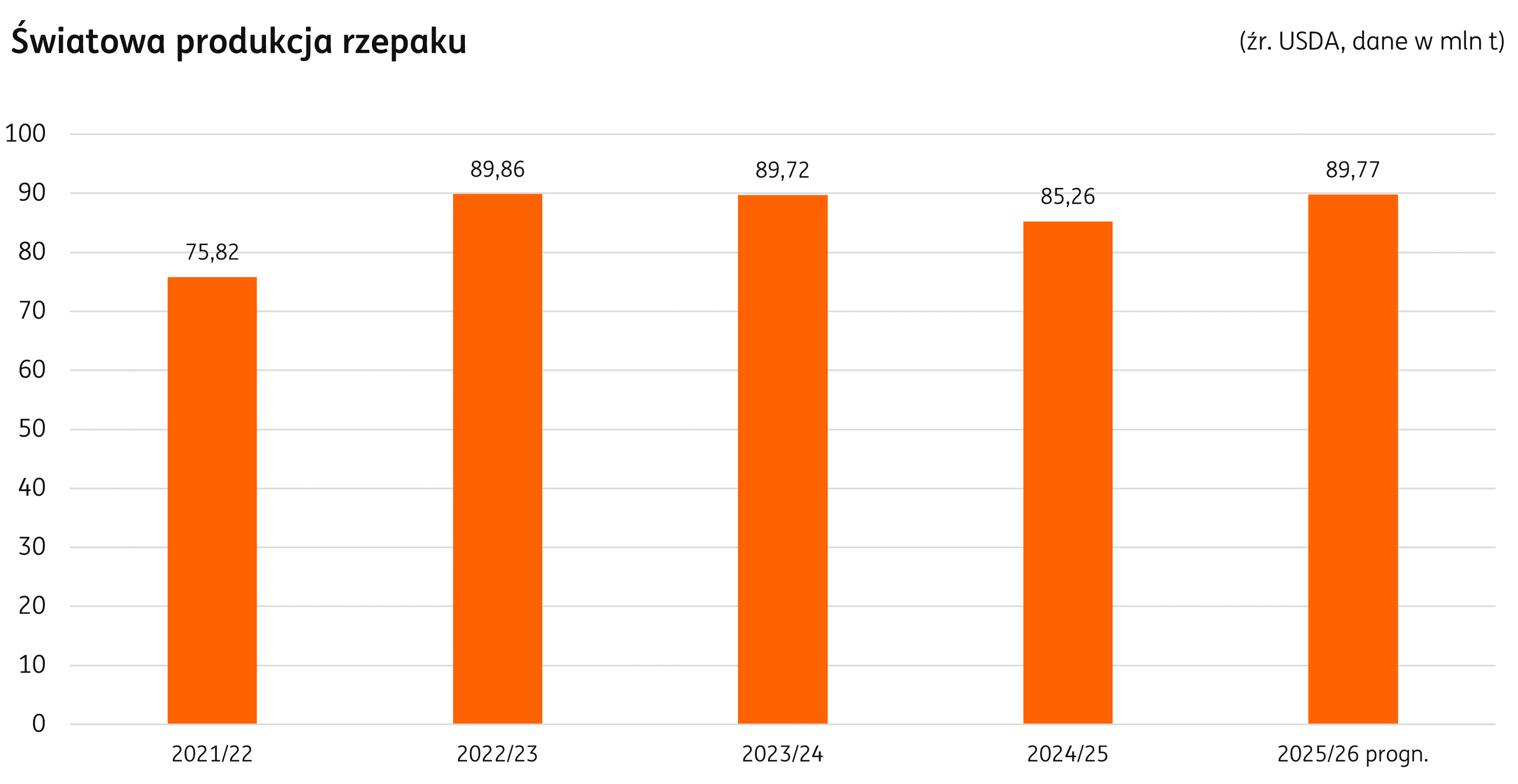 Świat: Aktualizacja pierwszej prognozy USDA (Departament Rolnictwa USA) na nowe zbiory w sezonie 2025/26 nie wpłynęła drastycznie na wartości dotyczące upraw rzepaku na świecie. Globalne zbiory są szacowane na niecałe 90 mln t. To o ponad 5% więcej niż w zeszłym roku. Największy wzrost produkcji prognozowany jest dla Unii Europejskiej – z 16,9 mln t do 19,4 mln t (13,6% r/r), to o 1% więcej niż w majowych szacunkach. Zbliża się w ten sposób do Kanady, której produkcja również rośnie (z 18,8 do 19,5 mln t r/r). Bez zmian w stosunku do danych sprzed miesiąca pozostają areał (43,4 mln ha, 2,2% więcej r/r) i wydajność (2,1 t/ha czyli 3% więcej r/).