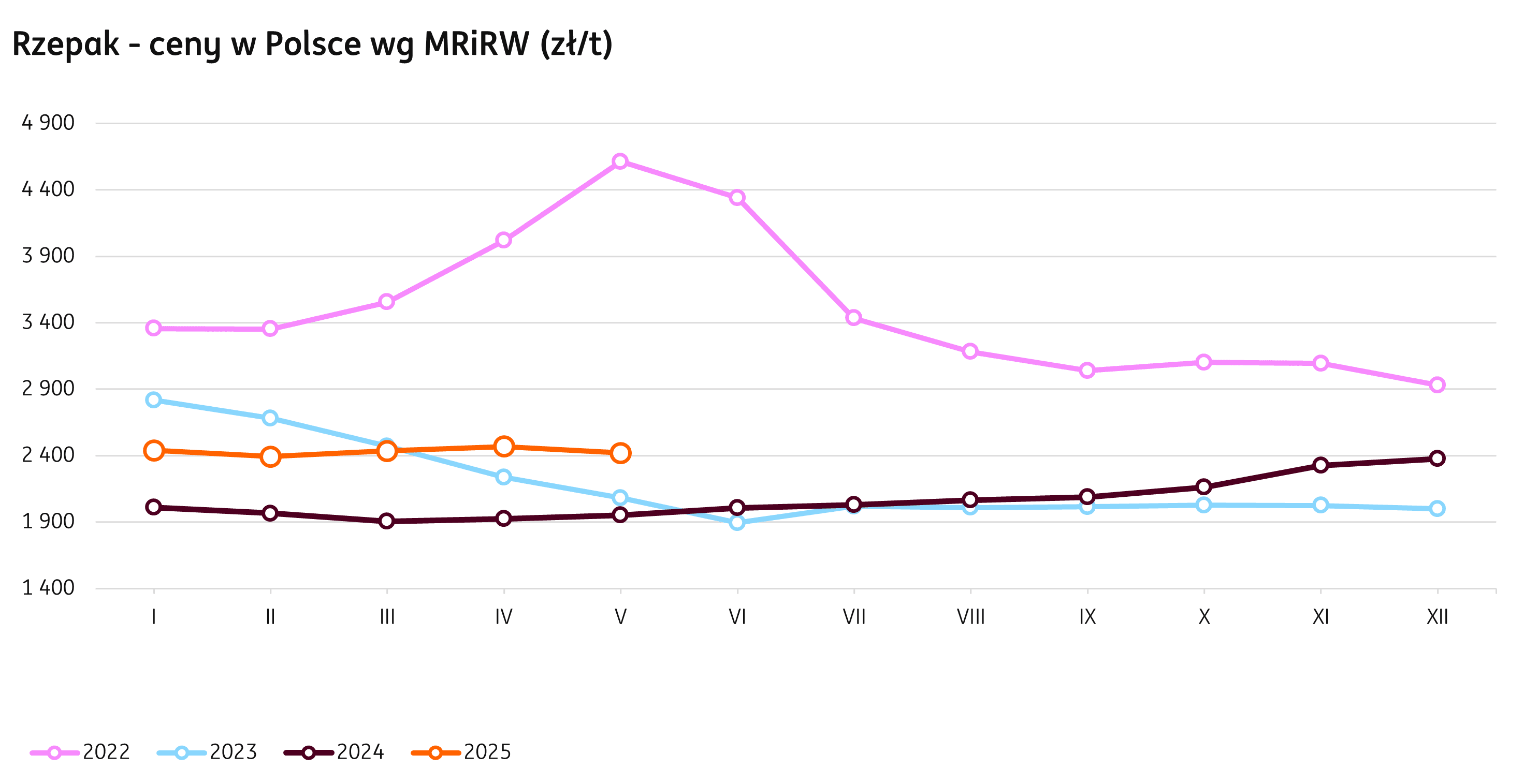 W tygodniu kończącym się 22 czerwca 2025 r. średnie stawki za rzepak wyniosły 2403 zł/t zgodnie z danymi MRiRW. W porównaniu z wcześniejszym tygodniem jest to wzrost o 39 zł (1,7%). W stosunku do zeszłego roku bieżące ceny są o 20% wyższe.