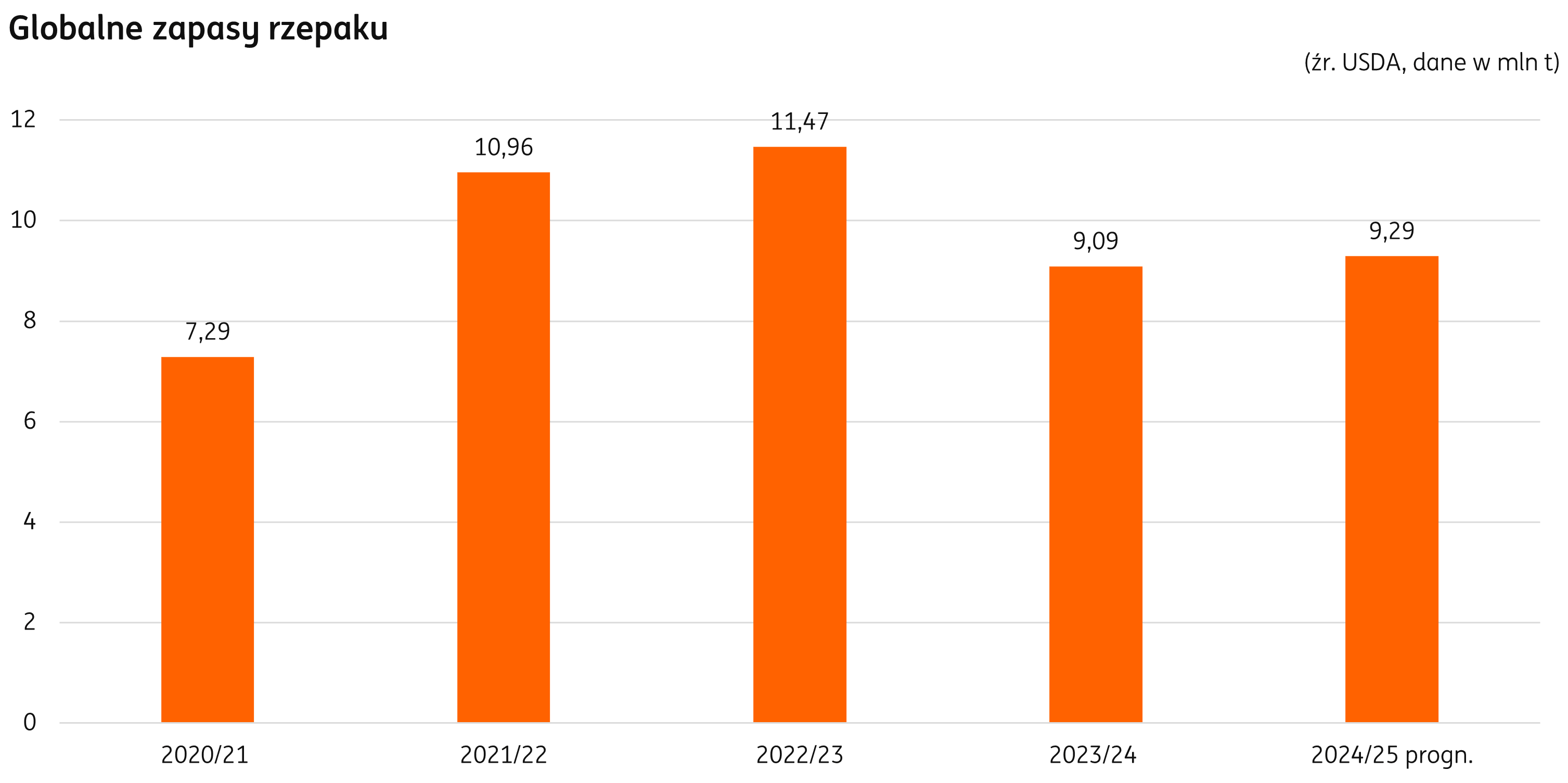 Szacunki dotyczące poziomu zapasów końcowych zostają utrzymane. Ich wolumen wyróżnił się najmniejszą zmianą w stosunku do wcześniejszego okresu. Według USDA w czerwcowym raporcie, wolumen ma utrzymać się powyżej 9 mln t. Wartość stabilizuje się po wcześniejszej dużej zmianie i spadku z 11,5 mln t na przełomie sezonów 2023/24 i 2024/25. Wtedy korekta wynika z redukcji wolumenu w Chinach, Kanadzie i UE.