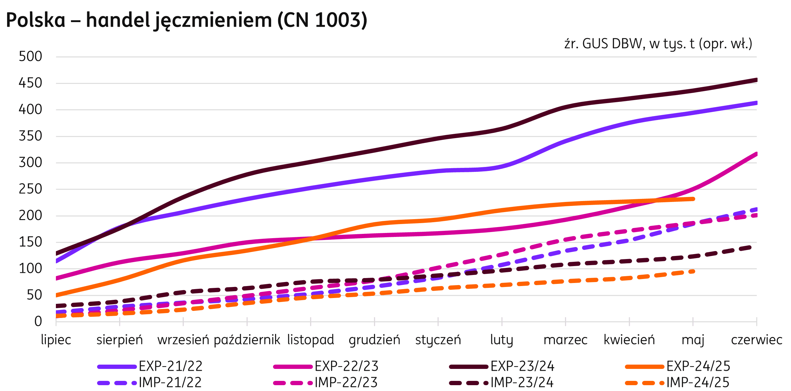 Handel. Na miesiąc przez końcem sezonu 2024/25 eksport jęczmienia kształtował się na poziomie 232 tys. t, o 47% poniżej poziomu ubiegłorocznego. W maju eksport jęczmienia był niższy o 67% od ubiegłego z tego okresu, osiągając 5 tys. t. Import od początku sezonu również pozostaje na poziomie niższym od ubiegłorocznego z wolumenem 95 tys. t (-23% r/r), a tylko w maju osiągnął 13 tys. t, o 44% mniej niż przed rokiem.