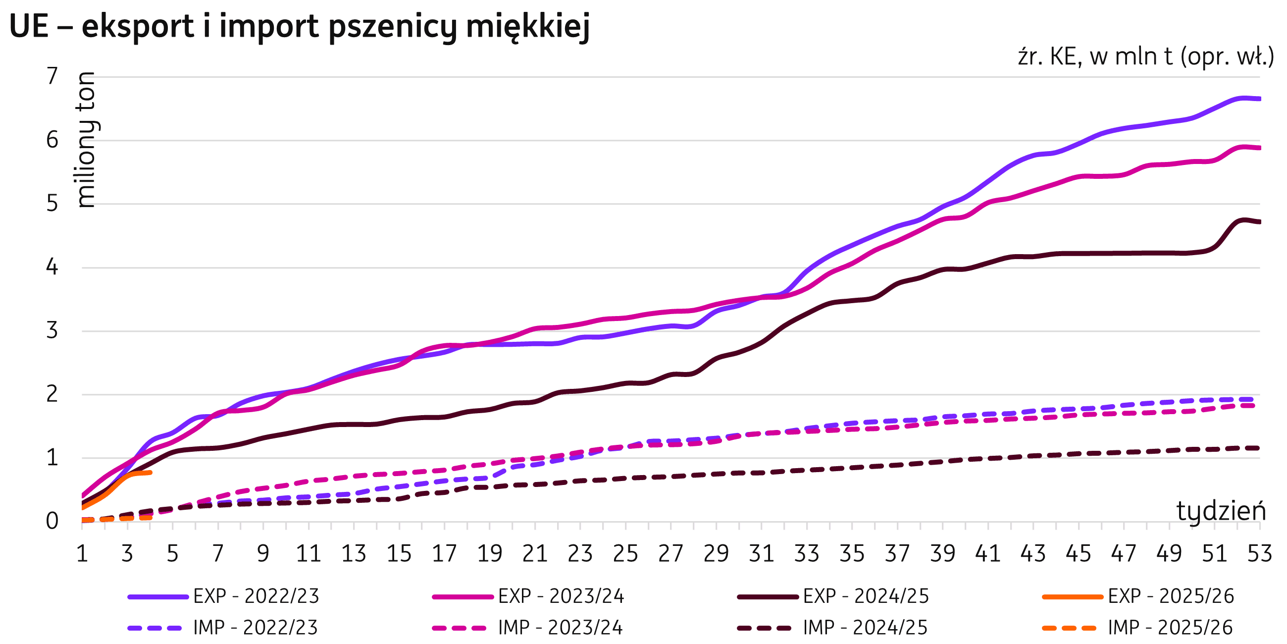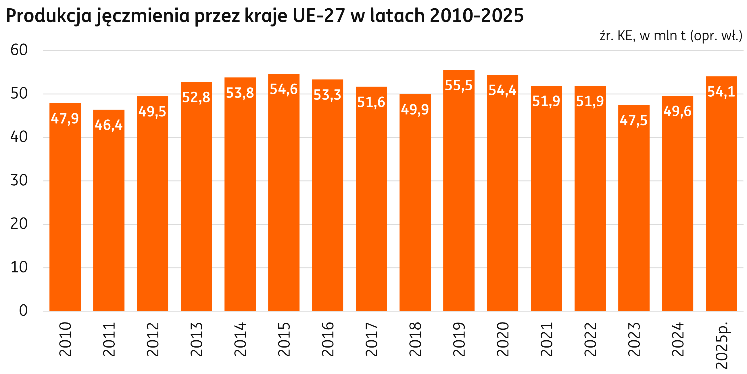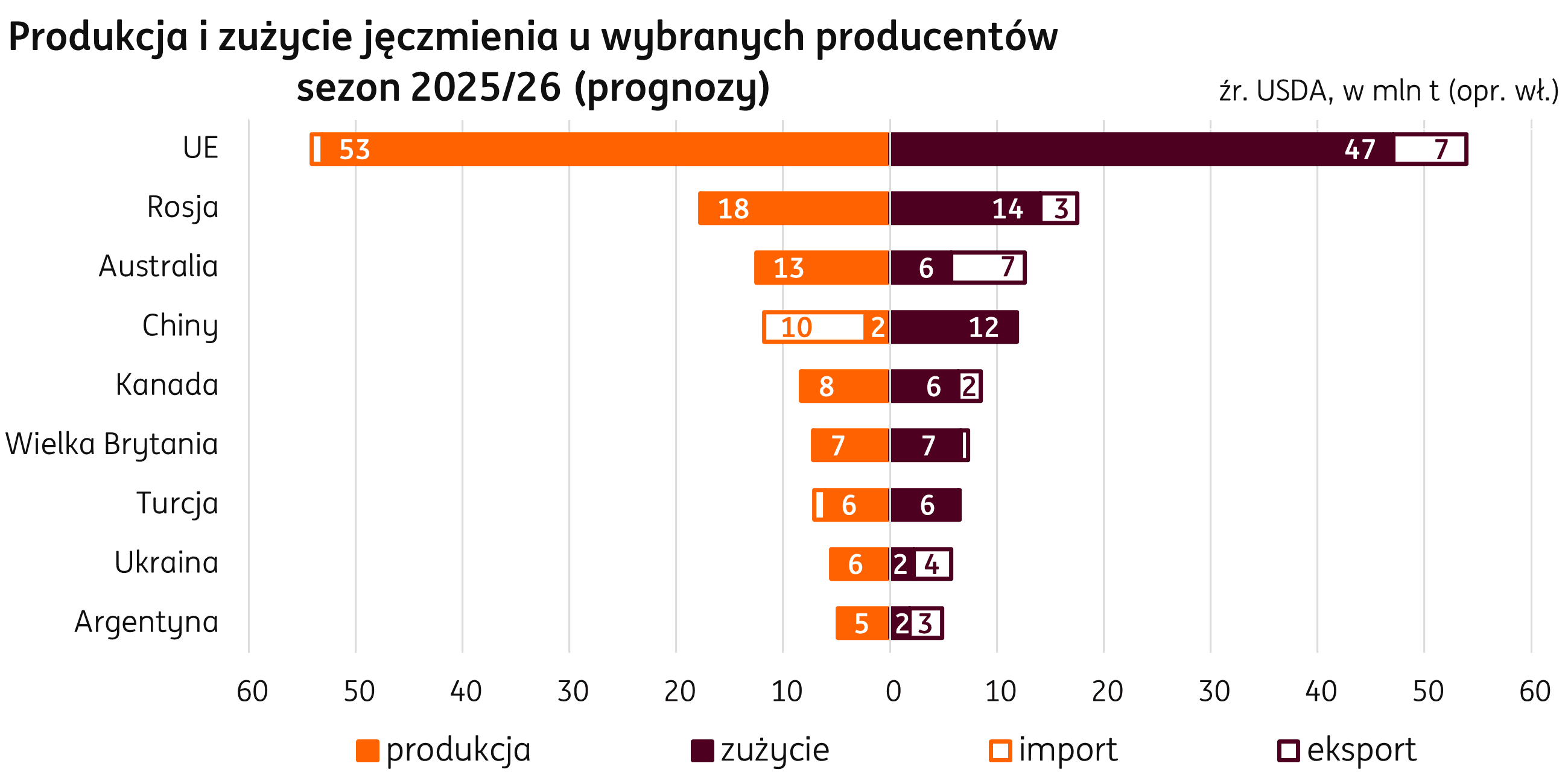Unia Europejska. W sezonie 2025/26, jak wynika z bilansu publikowanego przez KE, zużycie jęczmienia w krajach UE wyniesie 42,8 mln t, 0,3 mln t powyżej konsumpcji z sezonu 2024/25. Poziom eksportu ma wzrosnąć do 10,1 mln t (+1,6 mln t r/r), a zapasy końcowe są przewidywane na poziomie 5,3 mln t (+2,2 mln t r/r) przy podwyższonym do 1,5 mln t (+0,2 mln t r/r) imporcie.